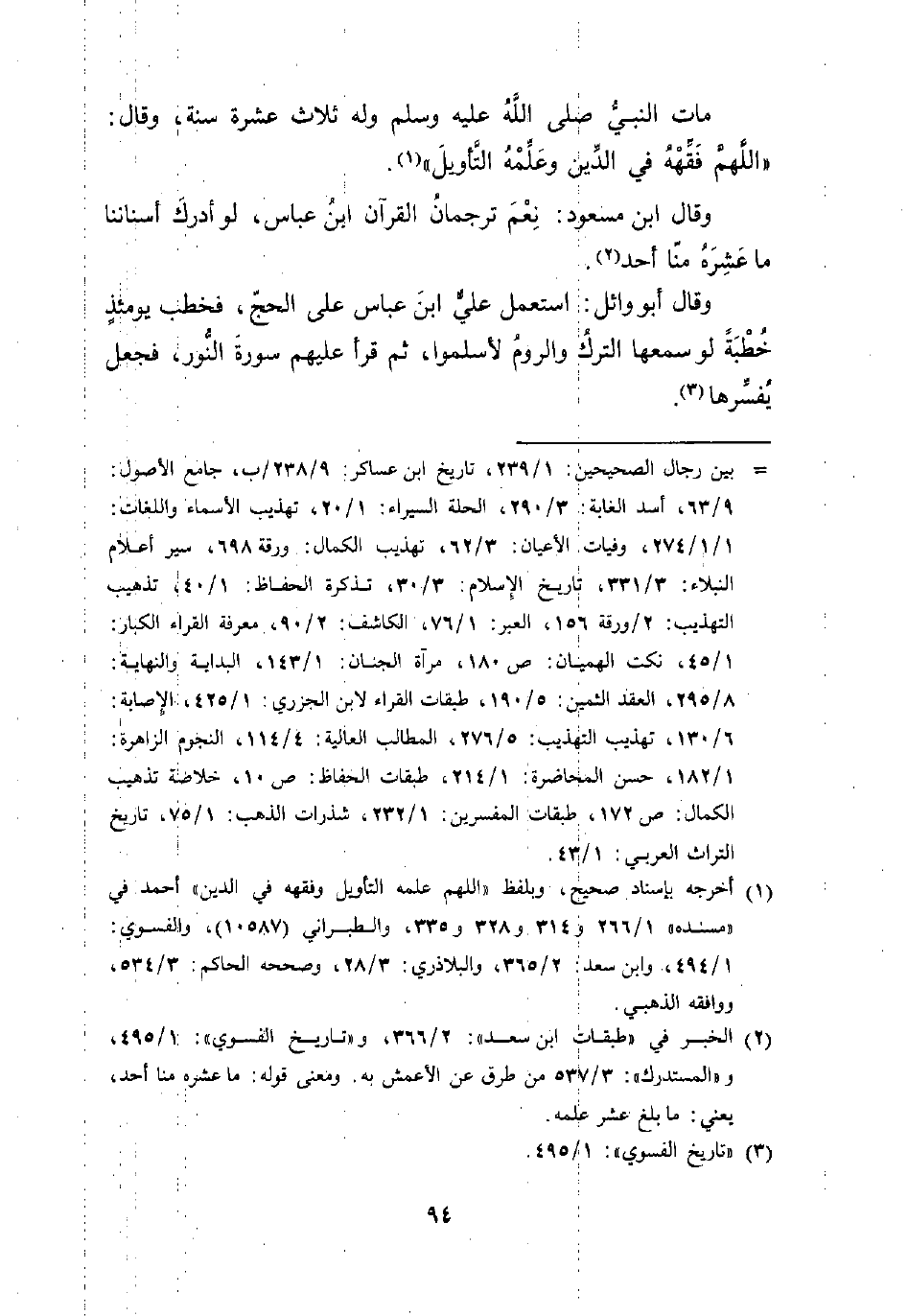 مات النبي صلى اللَّه عليه وسلم وله ثلاث عشرة سنة، وقال: "اللَّهم فَقِّهْهُ في الدِّين وعَلِّمْهُ التَّأويلَ" (¬1).