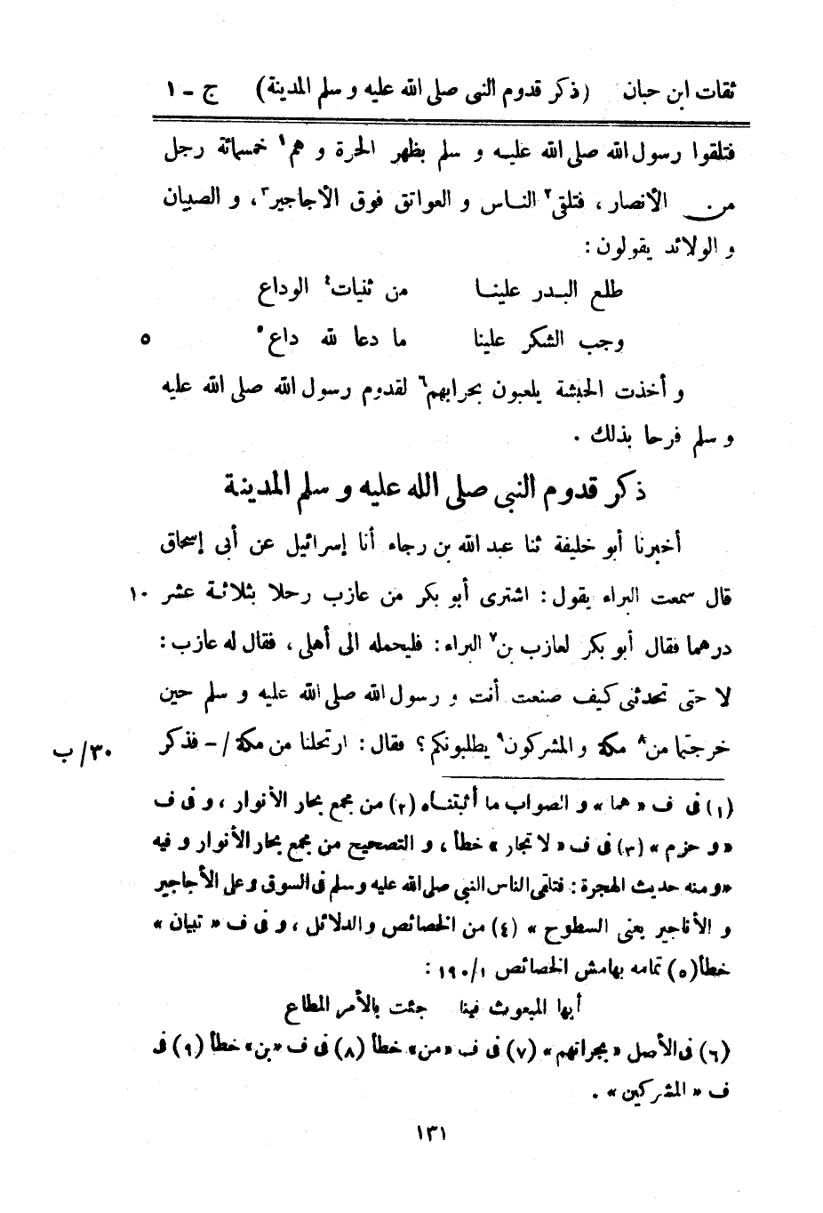 فتلقوا رَسُول اللَّهِ صَلَّى اللَّهُ عَلَيْهِ وَسَلَّمَ بِظهْر الْحرَّة وهم خَمْسمِائَة رجل من النصار فَتلقى النَّاس والعواتق فَوق الجاجير وَالصبيان والولائد يَقُولُونَ طلع الْبَدْر علينا من ثنيات الْوَدَاع وَجب الشُّكْر علينا مَا دَعَا لله دَاع وَأخذت الْحَبَشَة يَلْعَبُونَ بِحِرَابِهِمْ لقدوم رَسُول اللَّهِ صَلَّى اللَّهُ عَلَيْهِ وَسَلَّمَ فَرحا بذلك