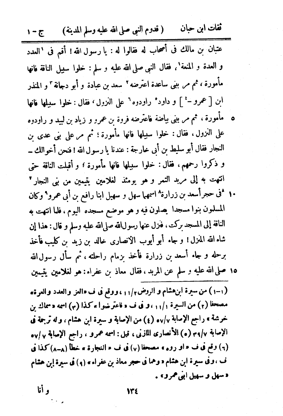 عتْبَان بْن مَالك فِي أَصْحَاب لَهُ فَقَالُوا لَهُ يَا رَسُول اللَّه أقِم فِي الْعدَد وَالْعدة والمنعة فَقَالَ النَّبِي صَلَّى اللَّهُ عَلَيْهِ وَسَلَّمَ خلوا سَبِيل النَّاقة فَإِنَّهَا مأمورة ثمَّ مر ببني سَاعِدَة اعْتَرَضَهُ سعد بْن عبَادَة وَأَبُو دُجَانَة وَالْمُنْذر بْن عَمْرو وَدَاوُد راودوه على النُّزُول فَقَالَ خلوا سَبِيلهَا فَإِنَّهَا مأمورة ثمَّ مر ببني بياضة فاعترضه فَرْوَة بْن عَمْرو وَزِيَاد بْن لبيد وراودوه على النُّزُول فَقَالَ خلوا سبيلهافانها مأمورة ثمَّ مر على بني عدي بْن النجار فَقَالَ أَبُو سليط بْن أبي خَارِجَة عندنَا يَا رَسُول اللَّه فَنحْن أخوالك وَذكروا رَحِمهم فَقَالَ خلوا سَبِيلهَا فَإِنَّهَا مأمورة وَأَقْبَلت النَّاقة حَتَّى انْتَهَت بِهِ إِلَى مربد التَّمْر وَهُوَ يَوْمئِذٍ لغلامين يتيمين من بني النجار فِي حجر أسعد بْن زُرَارَة اسمهما سهل وَسُهيْل ابْنا رَافع بن أَبى عممرو وَكَانَ الْمُسلمُونَ بنوا مَسْجِدا يصلونَ فِيهِ وَهُوَ مَوضِع مَسْجده الْيَوْم فَلَمَّا انْتَهَت بِهِ النَّاقة إِلَى الْمَسْجِد بَركت فَنزل عَنْهَا رَسُول اللَّهِ صَلَّى اللَّهُ عَلَيْهِ وَسَلَّمَ وَقَالَ هَذَا إِن شَاءَ اللَّه الْمنزل وَجَاء أَبُو أَيُّوب الْأنْصَارِيّ خَالِد بْن زيد بْن كُلَيْب فَأخذ برحله وَجَاء أسعد بْن زُرَارَة فَأخذ بزمام رَاحِلَته ثمَّ سَأَلَ رَسُول اللَّهِ صَلَّى اللَّهُ عَلَيْهِ وَسَلَّمَ عَن المربد فَقَالَ معَاذ بْن عفراء هُوَ لغلامين يتيمين