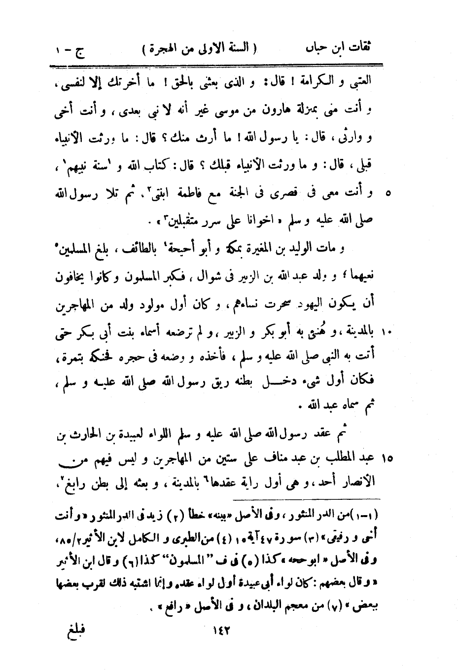الْعُتْبِي والكرامة قَالَ وَالَّذِي بَعَثَنِي بِالْحَقِّ مَا أخرتك إِلَّا لنَفْسي وَأَنت مني بِمَنْزِلَة هَارُون من مُوسَى غير أَنه لَا نَبِي بعدِي وَأَنت أخي ووراثي قَالَ يَا رَسُول اللَّه مَا أرث مِنْك قَالَ مَا ورثت الْأَنْبِيَاء قبلي قَالَ وَمَا ورثت الْأَنْبِيَاء قبلك قَالَ كتاب اللَّه وَسنة نَبِيّهم وَأَنت معي فِي قصري فِي الْجنَّة مَعَ فَاطِمَة ابْنَتي ثمَّ تَلا رَسُول اللَّهِ صَلَّى اللَّهُ عَلَيْهِ وَسَلَّمَ إِخْوَانًا على سرر متقبلين وَمَات الْوَلِيد بْن الْمُغيرَة بِمَكَّة وَأَبُو أحيحة بِالطَّائِف بلغ الْمُسلمين نعيهما وَولد عَبْد اللَّه بْن الزبير فِي شَوَّال فَكبر الْمُسلمُونَ وَكَانُوا يخَافُونَ أَن يكون الْيَهُود سحرت نِسَاءَهُمْ وَكَانَ أول مَوْلُود ولد من الْمُهَاجِرين بِالْمَدِينَةِ وهنىء بِهِ أَبُو بكر وَالزُّبَيْر وَلم ترْضِعه أَسمَاء بنت أبي بكر حَتَّى أَتَت بِهِ النَّبِي صَلَّى اللَّهُ عَلَيْهِ وَسَلَّمَ فَأَخذه وَوَضعه فِي حجرَة فحنكه بتمرة فَكَانَ أول شَيْء دخل بَطْنه ريق رَسُولُ اللَّهِ صَلَّى اللَّهُ عَلَيْهِ وَسَلَّمَ ثمَّ سَمَّاهُ عَبْد اللَّه ثمَّ عقد رَسُول اللَّهِ صَلَّى الله عَلَيْهِ وَسلم وَلم اللِّوَاء لعبيدة بْن الْحَارِث بْن عَبْد الْمطلب بْن عَبْد منَاف على سِتِّينَ من الْمُهَاجِرين وَلَيْسَ فيهم من النصار أحد وَهِي أول راية عقدهَا بِالْمَدِينَةِ وَبَعثه إِلَى بطن رابغ