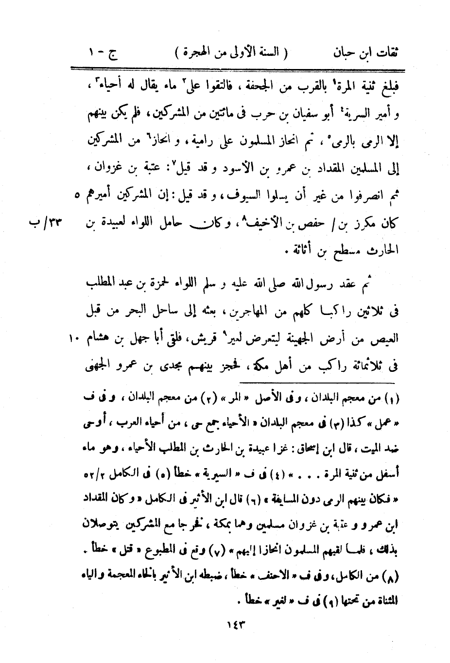 فَبلغ ثنية الْمرة بِالْقربِ من الْجحْفَة فَالْتَقوا على مَاء مَا يُقَال لَهُ أَحيَاء وأمير السّريَّة أَبُو سُفْيَان بْن حَرْب فِي مِائَتَيْنِ من الْمُشْركين فَلم يكن بَينهم إِلَّا الرَّمْي بِالرَّمْي ثمَّ انحاز الْمُسلمُونَ على رامية وانحاز من الْمُشْركين إِلَى الْمُسلمين الْمِقْدَاد بْن عَمْرو بْن الْأسود وَقد قيل عتبَة بْن غَزوَان ثمَّ انصرفوا من غير أَن يسلوا السيوف وَقد قيل إِن الْمُشْركين أَمِيرهمْ كَانَ مكرز بْن حَفْص بْن الْأَحْنَف وَكَانَ حَامِل اللِّوَاء لعبيدة بْن الْحَارِث مسطح بْن أَثَاثَة ثمَّ عقد رَسُول اللَّهِ صَلَّى اللَّهُ عَلَيْهِ وَسَلَّمَ اللِّوَاء لِحَمْزَة بْن عَبْد الْمطلب فِي ثَلَاثِينَ رَاكِبًا كلهم من الْمُهَاجِرين بَعثه إِلَى سَاحل الْبَحْر من قبل الْعيص من أَرض الجهينة ليتعرض لغير قُرَيْش فلقي أَبَا جهل بْن هِشَام فِي ثَلَاثمِائَة رَاكب من أهل مَكَّة فحجز بَينهم مجدي بْن عَمْرو الْجُهَنِيّ