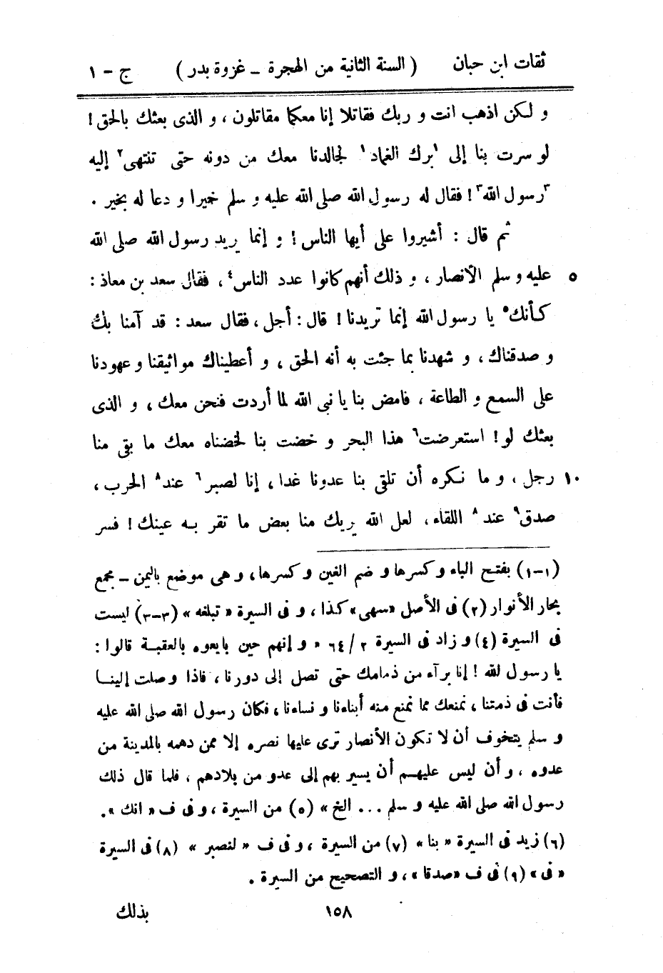 وَلَكِن اذْهَبْ أَنْت وَرَبك فَقَاتلا إِنَّا مَعَكُمَا مُقَاتِلُونَ وَالَّذِي بَعثك بِالْحَقِّ لَو سرت بِنَا إِلَى برك الغماد لجالدنا مَعَك من دونه حَتَّى تَنْتَهِي إِلَيْهِ رَسُول اللَّه فَقَالَ لَهُ رَسُول اللَّهِ صَلَّى اللَّهُ عَلَيْهِ وَسَلَّمَ خيرا ودعا لَهُ بِخَير ثمَّ قَالَ أَشِيرُوا على أَيهَا النَّاس وَإِنَّمَا يُرِيد رَسُول اللَّهِ صَلَّى اللَّهُ عَلَيْهِ وَسَلَّمَ الْأَنْصَار وَذَلِكَ أَنهم كَانُوا عدد النَّاس فَقَالَ سعد بْن معَاذ كَأَنَّك يَا رَسُول اللَّه إِنَّمَا تُرِيدنَا قَالَ أجل فَقَالَ سعد قد آمنا بك وَصَدَّقنَاك وشهدا بِمَا جِئْت بِهِ أننه الْحق وَأَعْطَيْنَاك مواثيقنا وعهودنا على السّمع وَالطَّاعَة فَامْضِ بِنَا يَا نَبِي اللَّه لما أردْت فنح مَعَك وَالَّذِي بَعثك لَو اسْتعْرضت هَذَا الْبَحْر وخضت بِنَا لَخُضْنَاهُ مَعَك مَاتَ بَقِي منا رجل وَمَا كره أَن تلقى بِنَا عدونا غَدا إننا لصبر عِنْد الْحَرْب صدق عِنْد اللِّقَاء لَعَلَّ اللَّه يُرِيك منا بعض مَا تقر بِهِ عَيْنك فسر