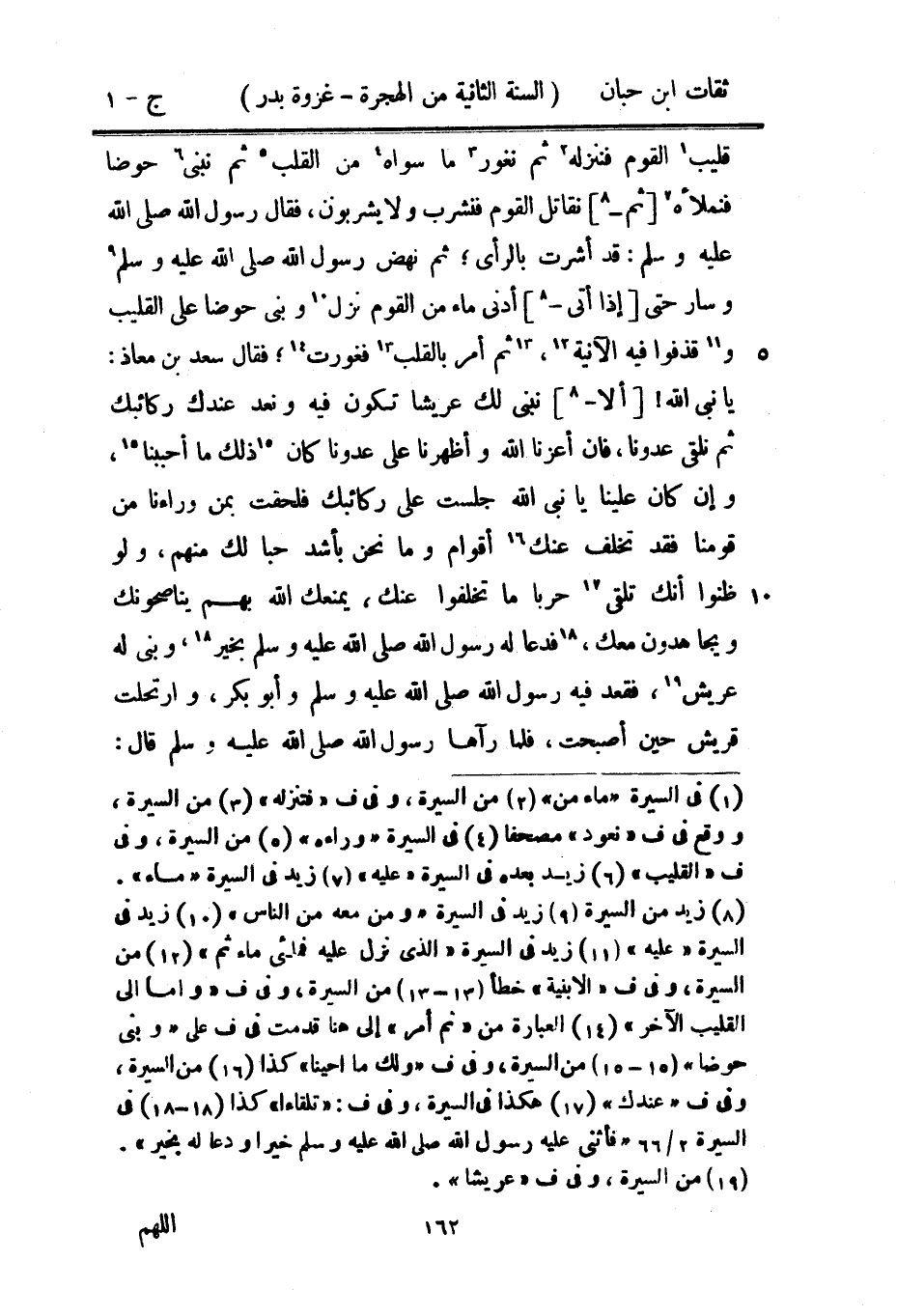 قليب الْقَوْم فنزله ثمَّ نغور مَا سواهُ من الْقلب ثمَّ نَبْنِي حوضا فنملأه ثمَّ نُقَاتِل فنشرب وَلَا يشربون فَقَالَ رَسُولُ اللَّهِ صَلَّى اللَّهُ عَلَيْهِ وَسَلَّمَ قد أَشرت بِالرَّأْيِ ثُمَّ نَهَضَ رَسُولُ اللَّهِ صَلَّى اللَّهُ عَلَيْهِ وَسَلَّمَ وَسَار حَتَّى إِذا أَتَى أدنى مَاء من الْقَوْم نزل وَبنى حوضاعلى القليب وقذفوا فِيهِ الْآنِية ثمَّ أَمر بِالْقَلْبِ فغورت فَقَالَ سعد بْن معَاذ يَا نَبِي اللَّه أَلا لَك عَرِيشًا تكون فِيهِ ونعد عنْدك ركائبك ثمَّ نلقي عدونا فَإِن أعزناالله وأظهرنا على عدونا كَانَ ذَلِك مَا أحببنا وَإِن كَانَ علينا يَا نَبِي اللَّه جَلَست على ركائبك فلحقت بِمن وَرَاءَنَا من قَومنَا فقد تخلف عَنْك أَقوام وَمَا نَحن بأشد حبا لَك مِنْهُم وَلَو ظنُّوا أَنَّك تلقى حَربًا مَا تخلفوا عَنْك يمنعك اللَّه بهم يناصحونك ويجاهدون مَعَك فَدَعَا لَهُ رَسُول اللَّهِ صَلَّى اللَّهُ عَلَيْهِ وَسَلَّمَ بِخَير وَبنى لَهُ عَرِيش فَقعدَ فِيهِ رَسُول اللَّهِ صَلَّى اللَّهُ عَلَيْهِ وَسَلَّمَ وَأَبُو بكر وَارْتَحَلت قُرَيْش حِين أَصبَحت فَلَمَّا رَآهَا رَسُول اللَّهِ صَلَّى اللَّهُ عَلَيْهِ وَسَلَّمَ قَالَ