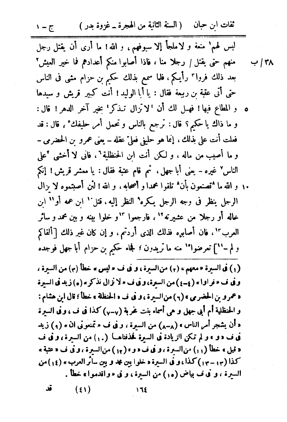 لَيْسَ لَهُم مَنْعَة وَلَا ملْجأ إِلَّا سيوفهم وَالله مَا أرى أَن يقتل رجل مِنْهُم حَتَّى يقتل رجلا منا فَإِذا أَصَابُوا مِنْك أعدادهم فَمَا خير الْعَيْش بعد ذَلِك فروا رَأْيكُمْ فَلَمَّا سمع بذلك حَكِيم بْن حزَام مَشى فِي النَّاس حَتَّى أَتَى عتبَة بْن ربيعَة فَقَالَ يَا أَبَا الْوَلِيد أَنْت كَبِير قُرَيْش وسيدها والمطاع فِيهَا فَهَل لَك أَن لَا تزَال تذكر بِخَير آخر الدَّهْر قَالَ وَمَا ذَاك يَا حَكِيم قَالَ ترجع بِالنَّاسِ وَتحمل أَمر خليفك قَالَ قد فعلت أَنْت عَليّ بذلك إِنَّمَا هُوَ حليفي فعلي عقله يَعْنِي عَمْرو بْن الْحَضْرَمِيّ وَمَا أُصِيب من مَاله وَلَكِن أَنْت بن الحنظلية فَإِنِّي لَا أخْشَى على النَّاس غَيره يَعْنِي أَبَا جهل ثمَّ قَامَ عتبَة فَقَالَ يَا معشر قُرَيْش إِنَّكُم وَالله مَا تَصْنَعُونَ بِأَن تلقوا مُحَمَّدًا وَأَصْحَابه وَالله لَئِن أصبتموه لَا يزَال الرجل ينظر فِي وَجه الرجل يكره النّظر إِلَيْهِ قتل بن عَمه أَو بن خَاله أَو رجلا من عشيرته فَارْجِعُوا وخلوا بَينه وَبَين مُحَمَّد وَسَائِر الْعَرَب فَإِن أَصَابُوهُ فَذَلِك الَّذِي أردتم وَإِن كَانَ غير ذَلِك ألقاكم وَلم تعرضوا مِنْهُ مَا تُرِيدُونَ فجَاء حَكِيم بْن حزَام أَبَا جهل فَوَجَدَهُ