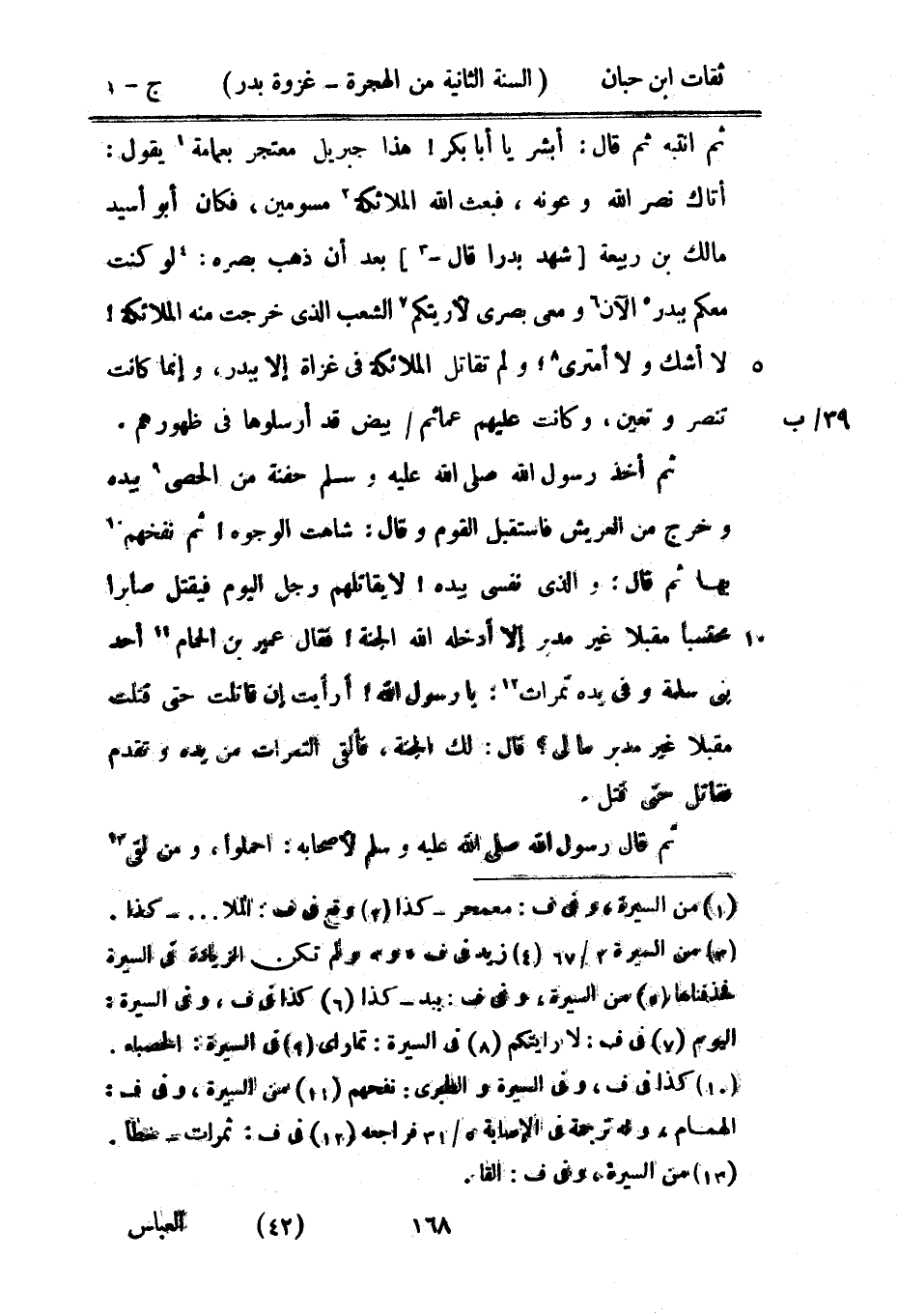 ثمَّ انتبه ثمَّ قَالَ أبشر يَا أَبَا بكر هَذَا جِبْرِيل متعجر بعمامة يَقُول أَتَاك نصر اللَّه وعونه فَبعث اللَّه الْمَلَائِكَة مسومين فَكَانَ أَبُو أسيد مَالك بْن ربيعَة شهد بَدْرًا قَالَ بعد أَن ذهب بَصَره لَو كنت مَعكُمْ ببدر الْآن وَمَعِي بصرى لَأَرَيْتُكُمْ الشّعب الَّذِي خرجت مِنْهُ الْمَلَائِكَة لَا أَشك وَلَا أمتري وَلم تقَاتل الْمَلَائِكَة فِي غزَاة إِلَّا ببدر وَإِنَّمَا كَانَت تنصر وَعين وَكَانَت عَلَيْهِم عمائم بيض قد أرسلوها فِي ظُهُورهمْ ثمَّ أَخذ رَسُولُ اللَّهِ صَلَّى اللَّهُ عَلَيْهِ وَسَلَّمَ حفْنَة من الْحَصَى بِيَدِهِ وَخرج من الْعَريش فَاسْتقْبل الْقَوْم وَقَالَ شَاهَت الْوُجُوه ثمَّ نَفَخَهُمْ بهَا ثمَّ قَالَ وَالَّذِي نَفسِي بِيَدِهِ لَا يقاتلهم رجل الْيَوْم فَيقْتل صَابِرًا محتسبا مُقبلا غير مُدبر إِلَّا أدخلهُ اللَّه الْجنَّة فَقَالَ عُمَيْر بن الحمتام أحد بني سَلمَة وَفِي يَده تمرات يَا رَسُول اللَّه أَرَأَيْت إِن قَاتَلت حَتَّى قتلت مُقبلا غير مُدبر مَا لي قَالَ لَك الْجنَّة فَألْقى التمرات من يَده وَتقدم فقاتل حَتَّى قتل ثمَّ قَالَ رَسُول اللَّهِ صَلَّى اللَّهُ عَلَيْهِ وَسَلَّمَ لأَصْحَابه احملوا وَمن لقى