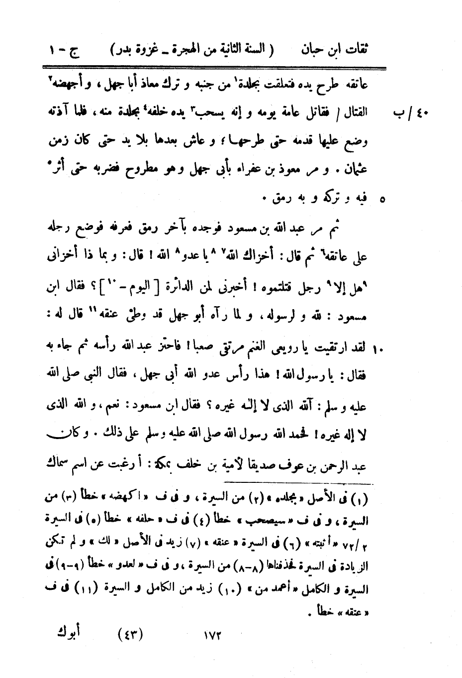 عَاتِقه طرح يَده فتعلقت بجلده من جنبه وَترك معَاذ أَبَا جهل وأجهضه الْقِتَال فقاتل عَامَّة وَإنَّهُ يسحب يَده خَلفه بجلده مِنْهُ فَلَمَّا آذته وضع عَلَيْهَا قدمه حَتَّى طرحها وعاش يعدها بِلَا يَد حَتَّى كَانَ زمن عُثْمَان وَمر معوذ بْن عفراء بِأبي جهل وَهُوَ مطروح فَضَربهُ حَتَّى أثر فِيهِ وَتَركه وَبِه رَمق ثمَّ مر عَبْد اللَّه بْن مَسْعُود فَوَجَدَهُ بآخر رَمق فَعرفهُ فَوضع رجله على عَاتِقه ثمَّ قَالَ أخزاك اللَّه يَا عَدو اللَّه قَالَ وَبِمَاذَا أخزاني هَل إِلَّا رجل قَتَلْتُمُوهُ أَخْبرنِي لمن الدائرة الْيَوْم فَقَالَ بن مَسْعُود لله وَلِرَسُولِهِ وَلما رَآهُ أَبُو جهل قد وطى عُنُقه قَالَ لَهُ لقد ارتقيت يَا رويعى الْغنم مرتقى صعبًا فاحتز عَبْد اللَّه رَأسه ثمَّ جَاءَ بِهِ فَقَالَ يَا رَسُول اللَّه هَذَا رَأس عَدو اللَّه أبي جهل فَقَالَ النَّبِي صَلَّى اللَّهُ عَلَيْهِ وَسَلَّمَ اللَّه الَّذِي لَا إِلَه غَيره فَقَالَ بن مَسْعُود نعم وَالله الَّذِي لَا إِلَه غَيره فَحَمدَ اللَّه رَسُول اللَّهِ صَلَّى اللَّهُ عَلَيْهِ وَسَلَّمَ على ذَلِك وَكَانَ عَبْد الرَّحْمَن بْن عَوْف صديقا لأمية بْن خلف بِمَكَّة أرغبت عَن اسْم سماك