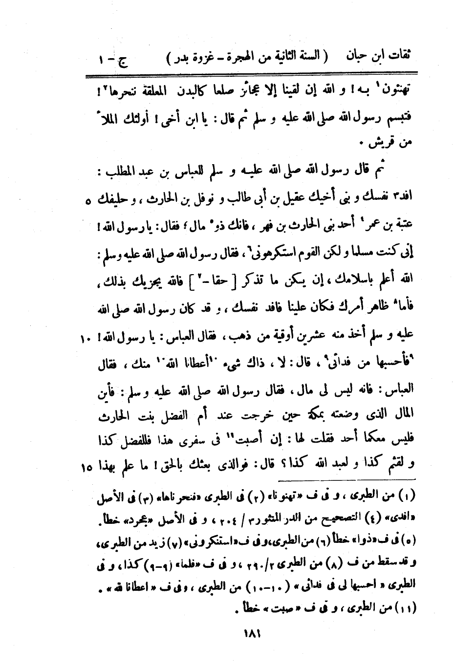 تهنئون بِهِ وَالله إِن لَقينَا إِلَّا عَجَائِز صلعًا كالبدن الْمُعَلقَة ننحرها فَتَبَسَّمَ رَسُول اللَّهِ صَلَّى اللَّهُ عَلَيْهِ وَسَلَّمَ ثمَّ قَالَ يَا بن أخي أُولَئِكَ الْمَلأ من قُرَيْش ثمَّ قَالَ رَسُول اللَّهِ صَلَّى اللَّهُ عَلَيْهِ وَسَلَّمَ للْعَبَّاس بْن عَبْد الْمطلب افْدِ نَفسك وَبني أَخِيك عقيل بْن أبي طَالب وَنَوْفَل بْن الْحَارِث وَحَلِيفك عتبَة بْن عمر أحد بني الْحَارِث بْن فهر فَإنَّك ذُو مَال فَقَالَ يَا رَسُول اللَّه إِنِّي كنت مُسلما وَلَكِن الْقَوْم استكرهوننى فَقَالَ رَسُولُ اللَّهِ صَلَّى اللَّهُ عَلَيْهِ وَسَلَّمَ اللَّه أعلم بِإِسْلَامِك إِن يكن مَا تذكر حَقًا فَالله يجْزِيك بذلك فَأَما ظَاهر أَمرك فَكَانَ علينا فَافْدِ نَفسك وَقد كَانَ رَسُول اللَّهِ صَلَّى اللَّهُ عَلَيْهِ وَسَلَّمَ أَخذ مِنْهُ عشْرين أُوقِيَّة من ذهب فَقَالَ الْعَبَّاس يَا رَسُول اللَّهِ فأحسبها من فدائي قَالَ لَا ذَاك شَيْء أَعْطَانَا اللَّه مِنْك فَقَالَ الْعَبَّاس فَإِنَّهُ لَيْسَ لي مَال فَقَالَ رَسُول اللَّهِ صَلَّى اللَّهُ عَلَيْهِ وَسَلَّمَ فَأَيْنَ المَال الَّذِي وَضعته بِمَكَّة حِين خرجت عِنْد أم الْفضل بنت الْحَارِث فَلَيْسَ مَعَكُمَا أحد فَقلت لَهَا إِن أصبت فِي سَفَرِي هَذَا فَلِلْفَضْلِ كَذَا ولقثم كَذَا ولعَبْد الله كَذَا قَالَ فو الَّذِي بَعثك بِالْحَقِّ مَا علم بِهَذَا