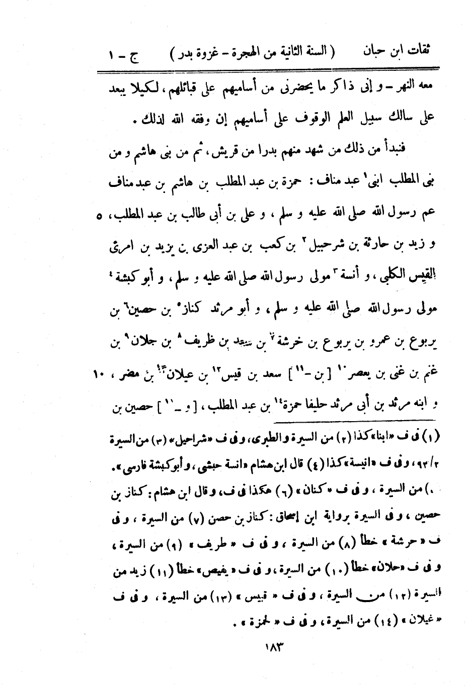 مَعَه النَّهر وَإِنِّي ذَاكر مَا يحضرني من أساميهم على قبائلهم لكيلا يبعد على سالك سَبِيل الْعلم الْوُقُوف على أساميهم إنن وَفقه اللَّه لذَلِك فنبدأ من ذَلِك من شهد مِنْهُم بَدْرًا من قُرَيْش ثمَّ من بني هَاشم وَمن بني عَبْد الْمطلب ابْني عَبْد منَاف حَمْزَة بْن عَبْد الْمطلب بْن هَاشم بْن عَبْد منَاف عَم رَسُول اللَّهِ صَلَّى اللَّهُ عَلَيْهِ وَسَلَّمَ وَعلي بْن أبي طَالب بْن عَبْد الْمطلب وَزيد بْن حَارِثَة بْن شُرَحْبِيل بْن كَعْب بْن عَبْد الْعُزَّى بْن يزِيد بْن امْرِئ الْقَيْس الْكَلْبِيّ وأنسة مولى رَسُول اللَّهِ صَلَّى اللَّهُ عَلَيْهِ وَسَلَّمَ وَأَبُو كَبْشَة مولى رَسُول اللَّهِ صَلَّى اللَّهُ عَلَيْهِ وَسَلَّمَ وَأَبُو مرْثَد كناز بْن حُصَيْن بْن يَرْبُوع بْن عَمْرو بْن يَرْبُوع بْن خَرشَة بْن سعد بْن ظريف بْن جلان بْن غنم بْن غنى بْن يعصر بْن سعد بْن قيس بْن عيلان بْن مُضر وَابْنه مرْثَد بْن أَبى مرْثَد حليفتا حَمْزَة بْن عَبْد الْمطلب وحصين بن