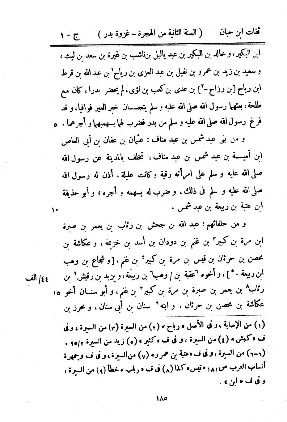 بْن البكير وَإيَاس بْن البكير وخَالِد بْن البكير بْن عَبْد ياليل بْن ناشب بْن غيرَة بْن سعد بْن لَيْث وَسَعِيد بْن زيد بْن عَمْرو بْن نفَيْل بْن عَبْد الْعُزَّى بْن ريَاح بْن عَبْد اللَّه بْن قرط بْن ريَاح بْن رزاح بْن عدي بْن كَعْب بْن لؤَي لم يحضر بَدْرًا كَانَ مَعَ طَلْحَة بعثهما رَسُول اللَّهِ صَلَّى اللَّهُ عَلَيْهِ وَسَلَّمَ يتجسسان خبر العير فوافيا وَقد فرغ رَسُولُ اللَّهِ صَلَّى اللَّهُ عَلَيْهِ وَسَلَّمَ من بدر فَضرب لَهما بسهميهما وأجرهما وَمن بني عَبْد شمس بْن عَبْد منَاف عُثْمَان بْن عَفَّان بْن أبي الْعَاصِ بْن أُميَّة بْن عَبْد شمس بْن عَبْد منَاف تخلف بِالْمَدِينَةِ عَن رَسُول اللَّهِ صَلَّى اللَّهُ عَلَيْهِ وَسَلَّمَ على امْرَأَته رقية وَكَانَت عليلة أذن لَهُ رَسُول اللَّهِ صَلَّى اللَّهُ عَلَيْهِ وَسَلَّمَ فِي ذَلِك وَضرب لَهُ بسهمه وأجره وَأَبُو حُذَيْفَة بْن عتبَة بْن ربيعَة بْن عَبْد شمس وَمن حلفائهم عَبْد اللَّه بْن جحش بْن رِئَاب بْن يعمر بْن صبرَة بْن مرّة بْن كَبِير بْن غنم بْن دودان بْن أَسد بْن خُزَيْمَة وعكاشة بْن مُحصن بْن حرثان بْن قيس بْن مرّة بْن كَبِير بْن غنم وشجاع بْن وهب بْن ربيعَة وَأَخُوهُ عقبَة بْن وهب بْن ربيعَة وَيزِيد بْن رُقَيْش بْن رِئَاب بْن يعمر بْن صبرَة بْن مرّة بْن كَبِير بْن غنم وَأَبُو سِنَان أَخُو عكاشة بْن مُحصن بْن حرثان وَابْنه سِنَان ومحرز بْن