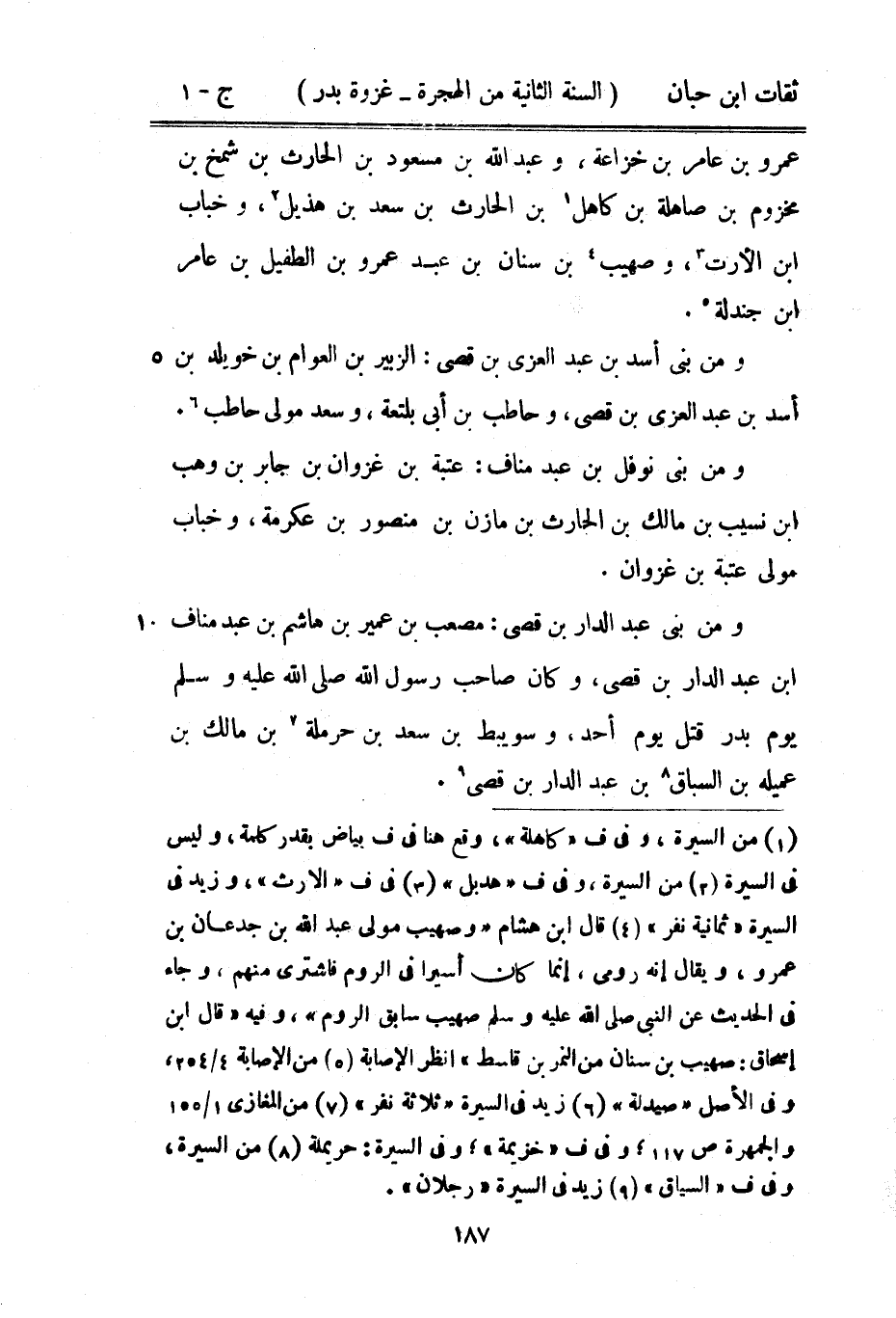 عَمْرو بْن عَامر بْن خُزَاعَة وَعبد اللَّه بْن مَسْعُود بْن الْحَارِث بْن شمخ بْن مَخْزُوم بْن صاهلة بْن كَاهِل بْن الْحَارِث بْن سعد بْن هُذَيْل وخباب بْن الْأَرَت وصهيب بْن سِنَان بْن عَبْد عَمْرو بْن الطُّفَيْل بْن عَامر بْن جندلة وَمن بني أَسد بْن عَبْد الْعُزَّى بْن قصي الزبير بْن الْعَوام بْن خويلد بْن أَسد بْن عَبْد الْعُزَّى بْن قصي وحاطب بْن أبي بلتعة وَسعد مولى حَاطِب وَمن بني نَوْفَل بْن مَالك بْن الْحَارِث بْن مَازِن بْن مَنْصُور بْن عِكْرِمَة وخباب مولى عتبَة بْن غَزوَان وَمن بني عَبْد الدَّار بْن قصي مُصعب بْن عُمَيْر بْن هَاشم بْن عَبْد منَاف بْن عَبْد الدَّار بْن قصي وَكَانَ صَاحب رَسُول اللَّهِ صَلَّى اللَّهُ عَلَيْهِ وَسَلَّمَ يَوْم بدر قتل يَوْم أحد وسويبط بْن سعد بْن حَرْمَلَة بْن مَالك بْن عميلة بْن السباق بْن عَبْد الدَّار بن قصي