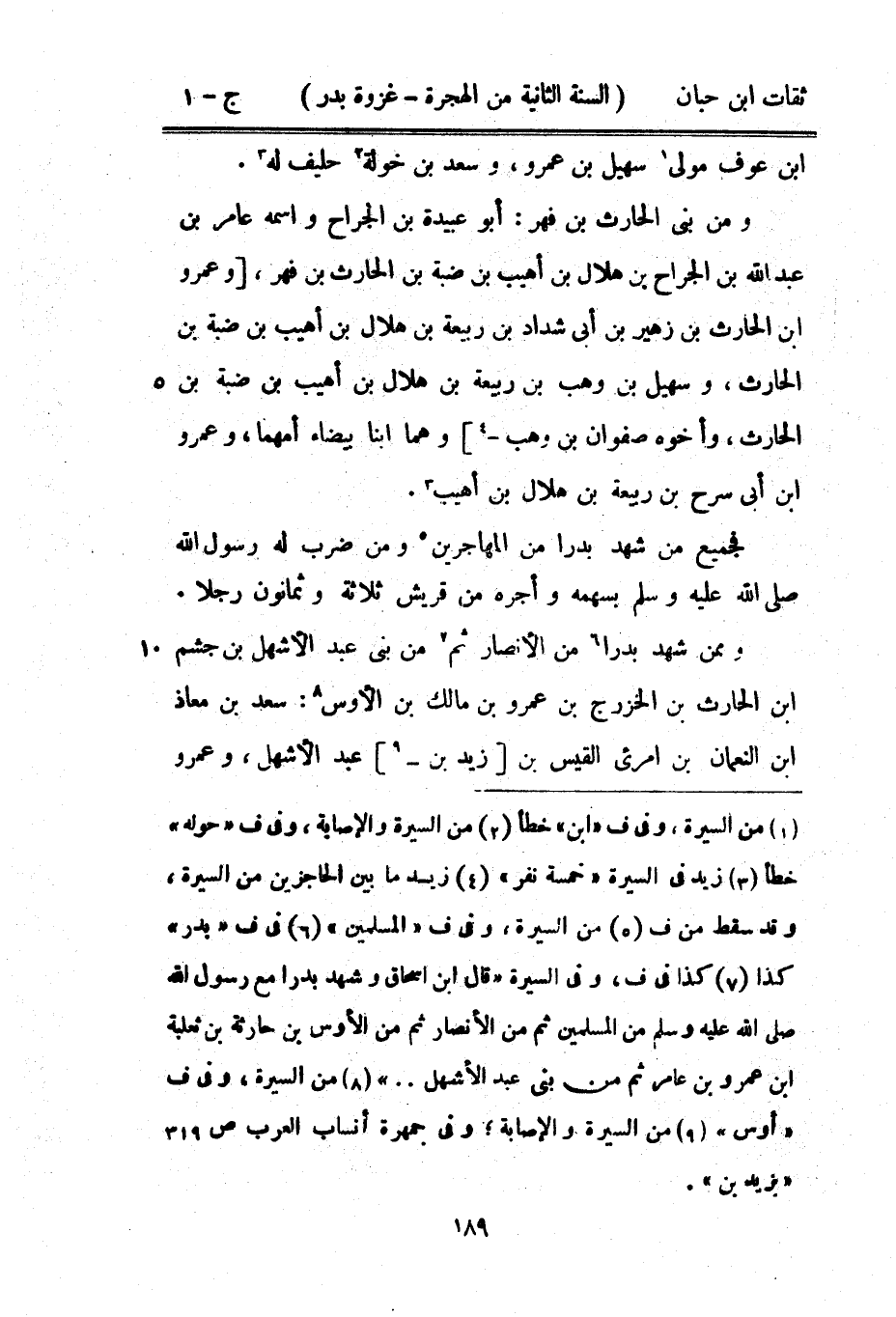اللَّه بْن سُهَيْل بْن عَمْرو بْن عَبْد شمس بْن عَبْد ود وَعُمَيْر بْن عَوْف مولى سُهَيْل بْن عَمْرو وَسعد بْن خَوْلَة حَلِيف لَهُ وَمن بني الْحَارِث بْن فهر أَبُو عُبَيْدَة بْن الْجراح واسْمه عَامر بْن عَبْد اللَّه بْن الْجراح بْن هِلَال بْن أهيب بْن ضبة بْن الْحَارِث بْن فهر وَعَمْرو بْن الْحَارِث بْن زُهَيْر بْن أبي شَدَّاد بْن ربيعَة بْن هِلَال بْن أهيب بْن ضبة بْن الْحَارِث وَسُهيْل بْن وهب بْن ربيعَة بْن هِلَال بْن أهيب بْن ضبة بْن الْحَارِث وَأَخُوهُ صَفْوَان بْن وهب وهما ابْنا بَيْضَاء أمهما وعمروابن أبي سرح بْن ربيعَة بْن هِلَال بْن أهيب فَجَمِيع من شهد بَدْرًا من الْمُهَاجِرين وَمن ضرب لَهُ رَسُول اللَّهِ صَلَّى اللَّهُ عَلَيْهِ وَسَلَّمَ بسهمه وأجره من قُرَيْش ثَلَاثَة وثمانونن رجلا وَمِمَّنْ شهد بَدْرًا من الْأَنْصَار ثمَّ من بني عَبْد الْأَشْهَل بن جشم بن الحارثص بْن الْخَزْرَج بْن عَمْرو بْن مَالك بْن الْأَوْس سعد بْن معَاذ بْن النُّعْمَان بْن امْرِئ الْقَيْس بْن زيد بْن عَبْد الْأَشْهَل وَعَمْرو بن