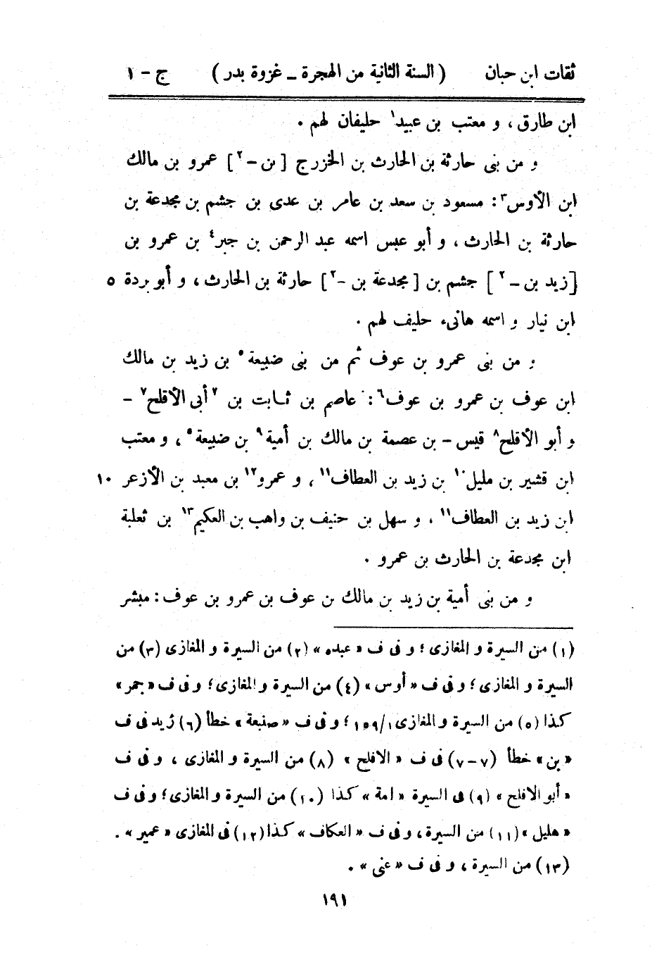 بْن طَارق ومعتب بْن عبيد حليفان لَهُم وَمن بني حَارِثَة بْن الْحَارِث بْن الْخَزْرَج بْن عَمْرو بْن مَالك بْن الْأَوْس مَسْعُود بْن سعد بْن عَامر بْن عدي بْن جشم بْن مجدعة بْن حَارِثَة بْن الْحَارِث وَأَبُو عبس اسْمه عَبْد الرَّحْمَن بْن جبر بْن عَمْرو بْن زيد بْن جشم بْن مجدعة بْن حَارِثَة بْن الْحَارِث وَأَبُو بردة بْن ننيار واسْمه هَانِئ حَلِيف لَهُم وَمن بننى عَمْرو بْن عَوْف ثمَّ من بني ضبعة بْن زيد بْن مَالك بْن عَوْف بْن عَمْرو بْن عَوْف عَاصِم بْن ثَابت بْن أبي الأقلح وَأَبُو الأقلح قيس بن عصمى ة بْن مَالك بْن أُميَّة بْن ضبيعة ومعتب بْن قُشَيْر بْن مليل بْن زيد بْن العطاف وَعَمْرو بن معبد بن الزعر بْن زيد بْن العطاف وَسَهل بْن حنيف بْن واهب بْن العكيم بْن ثَعْلَبَة بْن مجدعة بْن الْحَارِث بْن عَمْرو وَمن بني أُميَّة بْن زيد بْن مَالك بْن عَوْف بْن عَمْرو بن عَوْف مُبشر