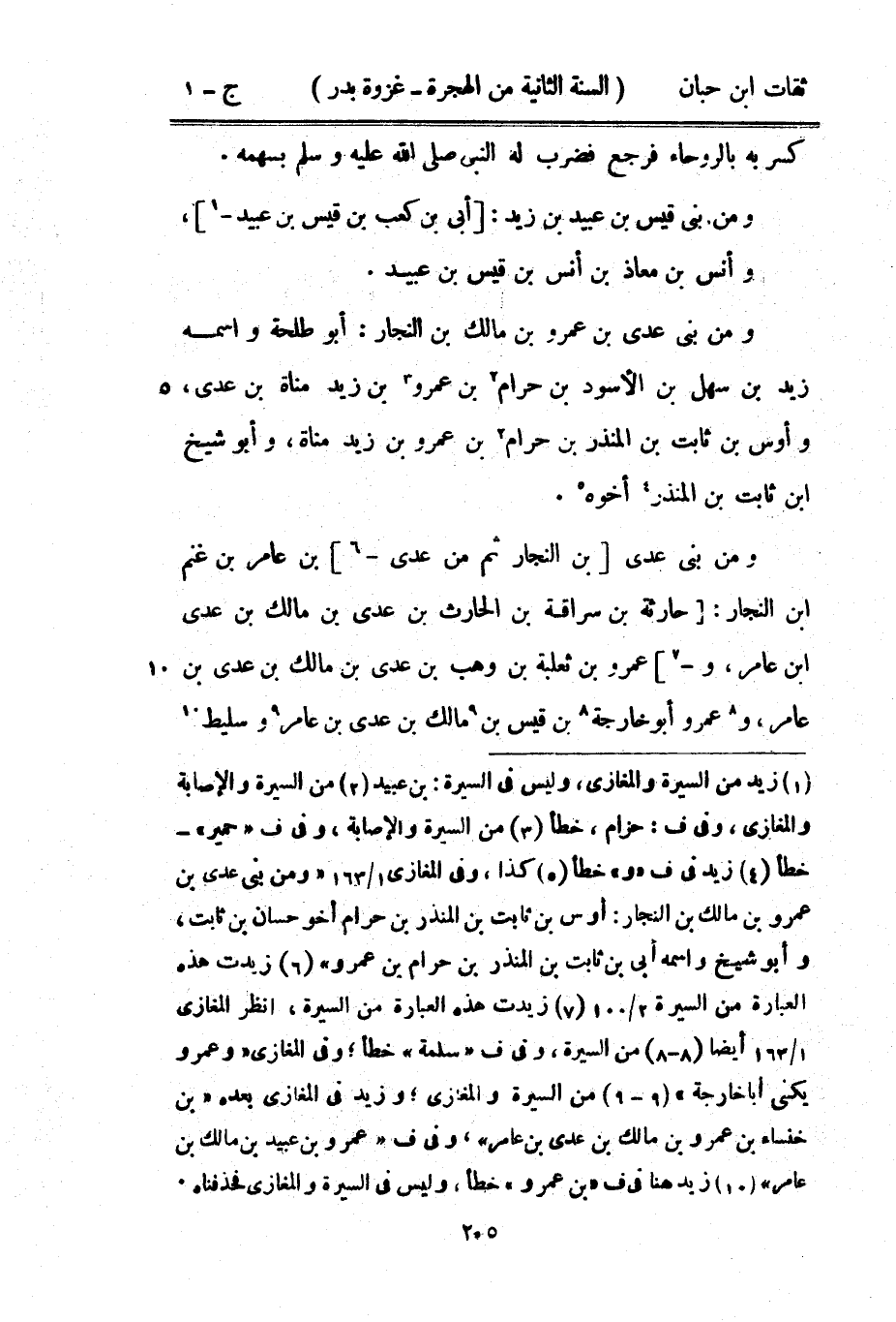 كسر بِهِ بِالرَّوْحَاءِ فَرجع فَضرب لَهُ النَّبِي صَلَّى اللَّهُ عَلَيْهِ وَسَلَّمَ بسهمه وَمن بني قيس بْن عبيد بْن زيد أبي بْن كَعْب بْن قيس بْن عبيد وَأنس بْن معَاذ بْن أنس بْن قيس بْن عبيد وَمن بني عدي بْن عَمْرو بْن مَالك بْن النجار أَبُو طَلْحَة واسْمه زيد بْن سهل بْن الْأسود بْن حرَام بْن عَمْرو بْن زيد مَنَاة بْن عدي وَأَوْس بْن ثَابت بْن الْمُنْذر بْن حرَام بْن عَمْرو بْن زيد مَنَاة وَأَبُو شيخ بْن ثَابت بْن الْمُنْذر أَخُوهُ وَمن بني عدي بْن النجار ثمَّ من عدي بْن عَامر بْن غنم بْن النجار حَارِثَة بْن سارقة بْن الْحَارِث بْن عدي بْن مَالك بْن عدي بْن عَامر وَعَمْرو بْن ثَعْلَبَة بْن وهب بْن عدي بْن مَالك بْن عدي بْن عَامر وَعَمْرو أَبُو خَارِجَة بْن قيس بْن مَالك بْن عدي بْن عَامر وسليط