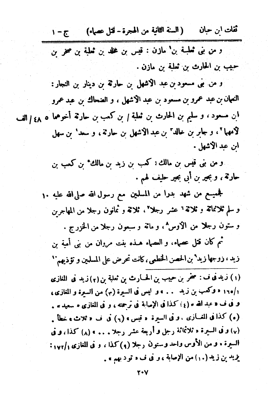 وَمن بني ثَعْلَبَة بْن مَازِن قيس بْن مخلد بْن ثَعْلَبَة بْن صَخْر بْن حبيب بْن الْحَارِث بْن ثَعْلَبَة بْن مَازِن وَمن بني مَسْعُود بْن عَبْد الْأَشْهَل بْن حَارِثَة بْن دِينَار بْن النجار النُّعْمَان بْن عَبْد عَمْرو بْن مَسْعُود بْن عَبْد الْأَشْهَل وَالضَّحَّاك بْن عَبْد عَمْرو بْن مَسْعُود وسليم بْن الْحَارِث بْن ثَعْلَبَة بْن كَعْب بْن حَارِثَة أخوهما لِأُمِّهِمَا وَجَابِر بْن خَالِد بْن عَبْد الْأَشْهَل بْن حَارِثَة وَسعد بْن سهل بْن عَبْد الْأَشْهَل وَمن بني قيس بْن مَالك كَعْب بْن زيد بْن مَالك بْن كَعْب بْن حَارِثَة وبجير بْن أبي بجير حَلِيف لَهُم فَجَمِيع من شهد بَدْرًا من الْمُسلمين مَعَ رَسُول اللَّهِ صَلَّى اللَّهُ عَلَيْهِ وَسَلَّمَ ثَلَاثمِائَة وَثَلَاثَة عشر رجلا منن الْمُهَاجِرين وَسِتُّونَ رجلا من الْأَوْس وَمِائَة وَسَبْعُونَ رجلا من الْخَزْرَج ثمَّ كَانَ قتل عصماء والعصماء هَذِه بنت مَرْوَان من بني أُميَّة بْن زيد زَوجهَا زيد بْن الْحصن الخطمي كَانَت تحرض على الْمُسلمين وتؤذيهم