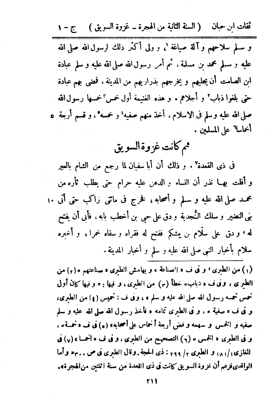 سِلَاحهمْ وَآله صياغة وَولي أَكثر ذَلِك لرَسُول اللَّهِ صَلَّى اللَّهُ عَلَيْهِ وَسَلَّمَ مُحَمَّد بْن مسلمة ثمَّ أَمر رَسُول اللَّهِ صَلَّى اللَّهُ عَلَيْهِ وَسَلَّمَ عبَادَة بْن الصَّامِت أَن يجليهم ويخرجهم بذراريهم من الْمَدِينَة فَمضى بهم عبَادَة حَتَّى بلغُوا ذُبَاب وأجلاهم وَهَذِه الْغَنِيمَة أول خمس خمسها رَسُول اللَّهِ صَلَّى اللَّهُ عَلَيْهِ وَسَلَّمَ فِي الْإِسْلَام أَخذ مِنْهُم صَفِيَّة وخمسه وَقسم أَرْبَعَة أَخْمَاسًا على الْمُسلمين ثمَّ كَانَت غَزْوَة السويق فِي ذِي الْقعدَة وَذَلِكَ أَن أَبَا سُفْيَان لما رَجَعَ من الشَّام بالعير وأفلت بهَا نذر أَن النِّسَاء والدهن عَلَيْهِ حرَام حَتَّى يطْلب ثَأْره من مُحَمَّد صَلَّى اللَّهُ عَلَيْهِ وَسَلَّمَ وَأَصْحَابه فَخرج فِي مِائَتي رَاكب حَتَّى أَتَى بني النَّضِير وسلك النجدية ودق على حييّ بْن أَخطب بَابه فَأبى أَن يفتح لَهُ ودق على سَلام بْن مشْكم فَفتح لَهُ فقراه وسقاه خمرًا وَأخْبرهُ سَلام بأخبار النَّبِي صَلَّى اللَّهُ عَلَيْهِ وَسَلَّمَ وأخبار الْمَدِينَة