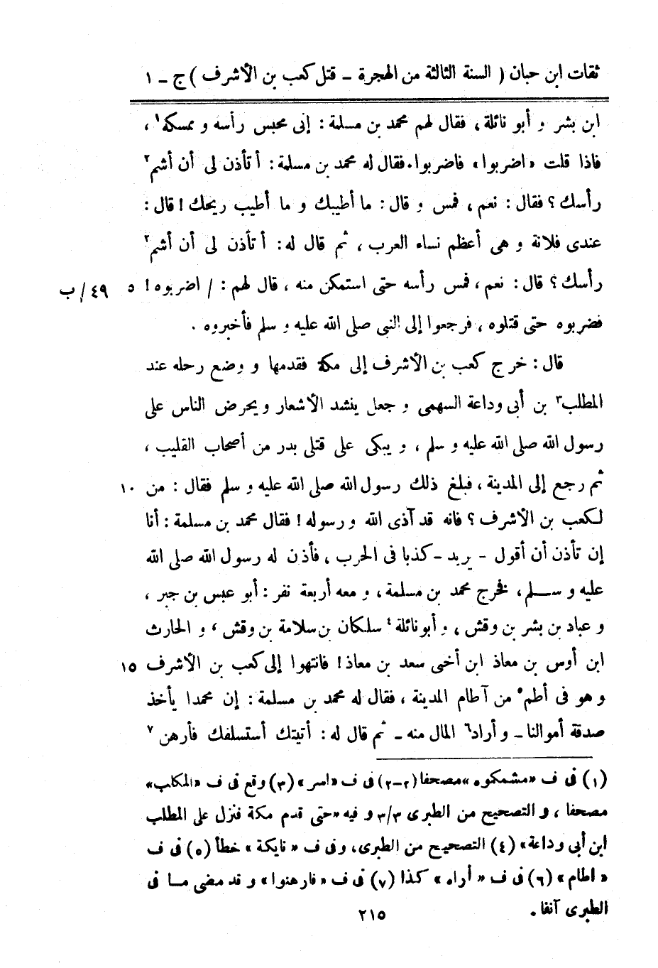 بْنُ بِشْرٍ وَأَبُو نَائِلَةَ فَقَالَ لَهُمْ مُحَمَّدُ بْنُ مَسْلَمَةَ إِنِّي مُحْبِسٌ رَأْسَهُ وَمُمْسِكُهُ فَإِذَا قُلْتُ اضْرِبُوا فَاضْرِبُوا فَقَالَ لَهُ مُحَمَّدُ بْنُ مَسْلَمَةَ أَتَأْذَنُ لِي أَنْ أَشُمَّ رَأْسَكَ فَقَالَ نَعَمْ فَمَسَّ وَقَالَ مَا أَطْيَبَكَ وَمَا أَطْيَبَ رِيحَكَ قَالَ عِنْدِي فُلانَةٌ وَهِيَ أَعْظَمُ نِسَاءِ الْعَرَبِ ثُمَّ قَالَ لَهُ أَتَأْذَنُ لِي أَنْ أَشُمَّ رَأْسَكَ قَالَ نَعَمْ فَمَسَّ رَأْسَهُ حَتَّى استكمن مِنْهُ قَالَ لَهُمْ اضْرِبُوهُ فَضَرَبُوهُ حَتَّى قَتَلُوهُ فَرَجَعُوا إِلَى النَّبِيِّ صَلَّى اللَّهُ عَلَيْهِ وَسَلَّمَ فَأَخْبَرُوهُ قَالَ خرج كَعْب بْن الْأَشْرَف إِلَى مَكَّة فَقَدمهَا وَوضع رجله عَبْد الْمطلب بْن أبي ودَاعَة السَّهْمِي وَجعل ينشد الْأَشْعَار ويحرض النَّاس على رَسُول اللَّهِ صَلَّى اللَّهُ عَلَيْهِ وَسَلَّمَ ويبكى على قَتْلَى بدر من أَصْحَاب القليب ثمَّ رَجَعَ إِلَى الْمَدِينَة فَبلغ ذَلِك رَسُول اللَّهِ صَلَّى اللَّهُ عَلَيْهِ وَسَلَّمَ فَقَالَ من لكعب بْنِ الأَشْرَفِ فَإِنَّهُ قَدْ آذَى اللَّه وَرَسُوله فَقَالَ مُحَمَّد بْن مسلمة أَنا إِن تَأذن أَن أَقُول يُرِيد كذبا فِي الْحَرْب فَأذن لَهُ رَسُول اللَّهِ صَلَّى اللَّهُ عَلَيْهِ وَسَلَّمَ فَخرج مُحَمَّد بْن مسلمة وَمَعَهُ أَرْبَعَة نفر أَبُو عبس بْن جبر وَعباد بْن بشر بْن وقش وَأَبُو نائلة سلكان بْن سَلامَة بْن وقش والْحَارث بْن أَوْس بْن معَاذ بن أخي سعد بْن معَاذ فَانْتَهوا إِلَى كَعْب بْن الْأَشْرَف وَهُوَ فِي أَطَم من آطام الْمَدِينَة فَقَالَ لَهُ مُحَمَّدُ بْنُ مَسْلَمَةَ إِن مُحَمَّدًا يَأْخُذ صَدَقَة أموالننا وَأَرَادَ المَال مِنْهُ ثمَّ قَالَ لَهُ أَتَيْتُك أستسلفك فأرهن