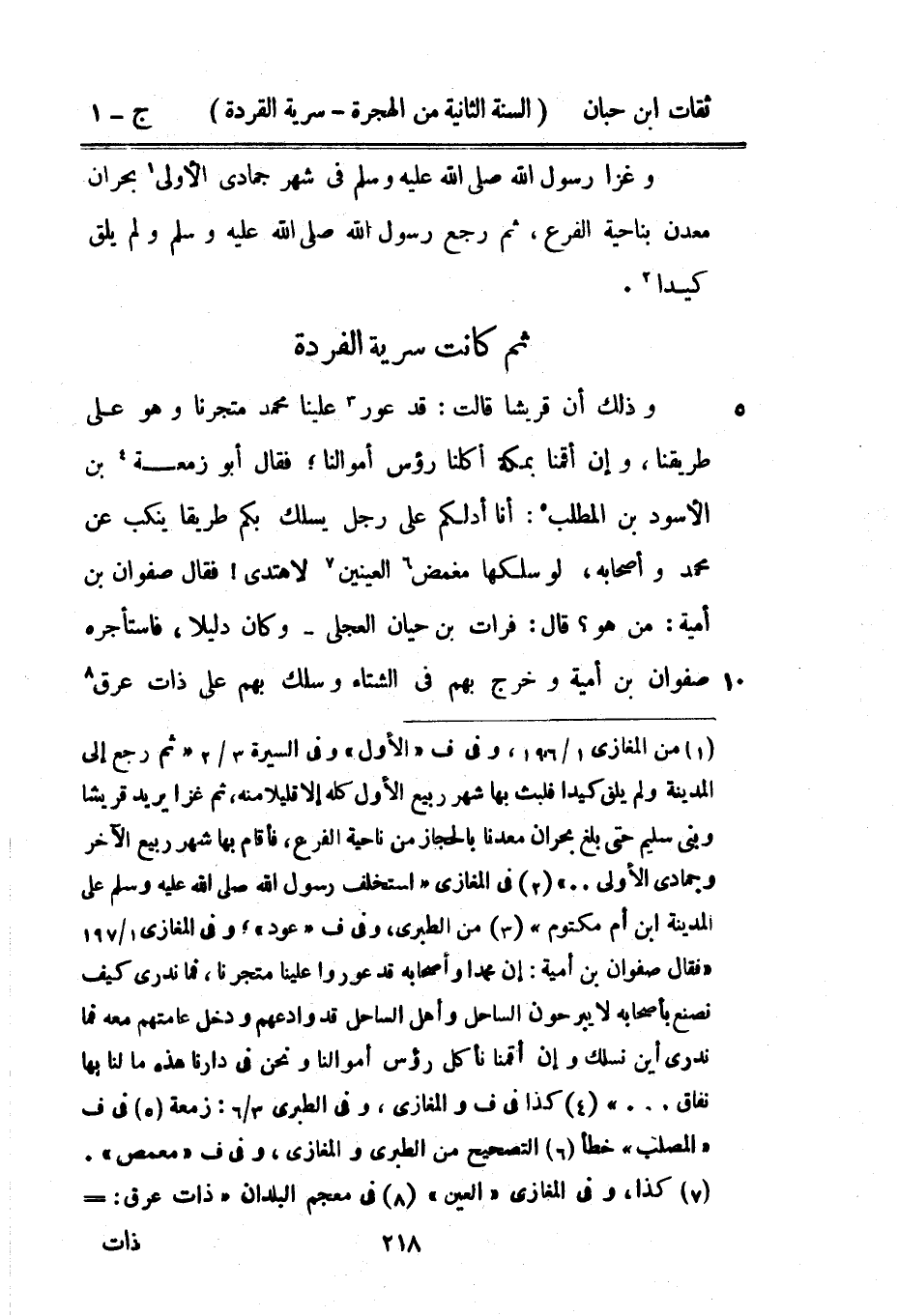 وغزا رَسُول اللَّهِ صَلَّى اللَّهُ عَلَيْهِ وَسَلَّمَ فِي شهر جُمَادَى الأولى بحران مَعْدن بِنَاحِيَة الْفَرْع ثمَّ رَجَعَ رَسُول صَلَّى اللَّهُ عَلَيْهِ وَسَلَّمَ وَلم يلق كيدا ثمَّ كَانَت سَرِيَّة الفردة وَذَلِكَ أَن قُريْشًا قَالَت قد عور علينا مُحَمَّد متجرنا وَهُوَ على طريقنا وَإِن أَقَمْنَا بِمَكَّة أكلنَا رُؤُوس أَمْوَالنَا فَقَالَ أَبُو زَمعَة بْن الْأسود بْن الْمطلب أَنا أدلكم على رجل يسْلك بكم طَرِيقا ينكب عَن مُحَمَّد وَأَصْحَابه لَو سلكها مغمض الْعَينَيْنِ لَا هتدى فَقَالَ صَفْوَان بْن أُميَّة من هُوَ قَالَ فرات بْن حَيَّان الْعجلِيّ وَكَانَ دَلِيلا فاستأجره صَفْوَان بْن أُميَّة وَخرج بهم فِي الشتَاء وسلك بهم على ذَات عرق