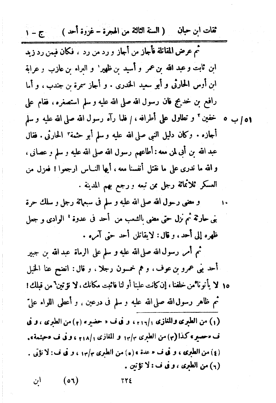 ثمَّ عرض الْمُقَاتلَة فَأجَاز من أجَاز ورد من رد فَكَانَ فِيمَن رد زيد بن ثابات وَعبد اللَّه بْن عمر وَأسيد بْن ظهير والبراء بْن عَازِب وعرابة بْن أَوْس الْحَارِثِيّ وَأَبُو سعيد الْخُدْرِيّ وَأَجَازَ سَمُرَة بْن جُنْدُب وَأما رَافع بْن خديج فَإِن رَسُول اللَّهِ صَلَّى اللَّهُ عَلَيْهِ وَسَلَّمَ استصغره فَقَامَ على خُفَّيْنِ وتطاول على أَطْرَافه فَلَمَّا رَآهُ رَسُول اللَّهِ صَلَّى اللَّهُ عَلَيْهِ وَسَلَّمَ أجَازه وَكَانَ دَلِيل النَّبِيَّ صَلَّى اللَّهُ عَلَيْهِ وَسَلَّمَ أَبُو حثْمَة الْحَارِثِيّ فَقَالَ عَبْد اللَّه بْن أبي لمن مَعَه أطاعهم رَسُول اللَّهِ صَلَّى اللَّهُ عَلَيْهِ وَسَلَّمَ وعصاني وَالله مَا نَدْرِي على مَا نقْتل أَنْفُسنَا مَعَه أَيهَا النَّاس ارْجعُوا فعزل من الْعَسْكَر ثَلَاثمِائَة رجل مِمَّن تبعه وَرجع بهم الْمَدِينَة وَمضى رَسُولُ اللَّهِ صَلَّى اللَّهُ عَلَيْهِ وَسَلَّمَ فِي سَبْعمِائة رجل وسلك حرَّة بني حَارِثَة ثمَّ نزل حَتَّى مضى بِالشعبِ من أحد فِي عدوة الْوَادي وَجعل ظَهره إِلَى أحد وَقَالَ لَا يقاتلنن أحد حَتَّى آمره ثمَّ أَمر رَسُولُ اللَّهِ صَلَّى اللَّهُ عَلَيْهِ وَسَلَّمَ على الرُّمَاة عَبْد اللَّه بْن جُبَير أحد بني عَمْرو بْن عَوْف وهم خَمْسُونَ رجلا وَقَالَ انْضَحْ عَنَّا الْخَيل لَا يَأْتُونَا من خلفنا إِن كَانَت علينا أَو لنا فَاثْبتْ مَكَانك لَا نُؤْتَيَنَّ من قبلك ثمَّ ظَاهر رَسُول اللَّهِ صَلَّى اللَّهُ عَلَيْهِ وَسَلَّمَ فِي درعين وَأعْطى اللِّوَاء على