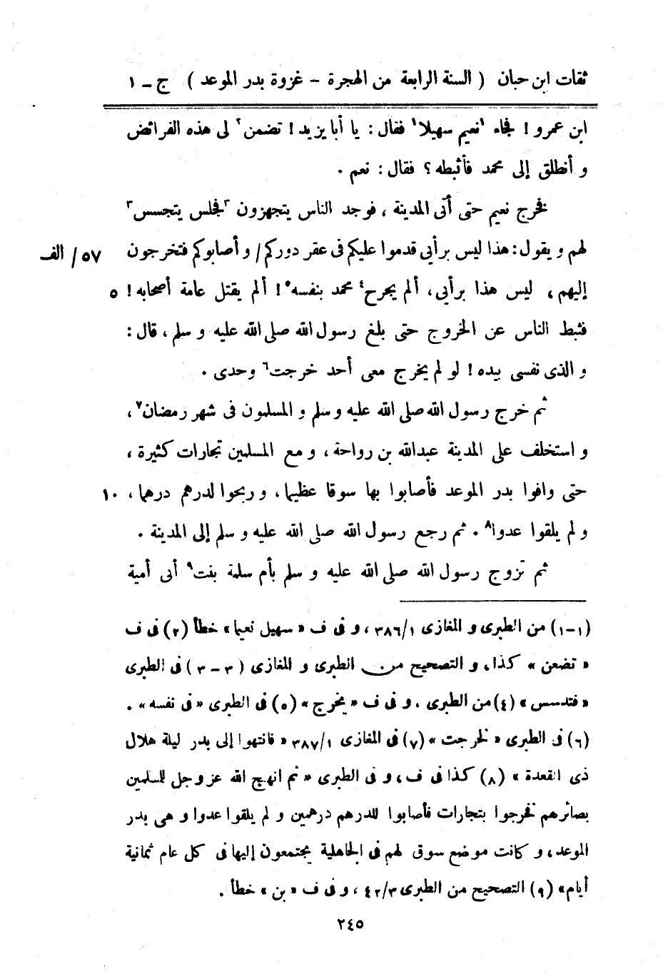 بن عَمْرو فجَاء نعيم سهيلا فَقَالَ يَا أَبَا يزِيد تضمن لي هَذِه الْفَرَائِض وأنطلق إِلَى مُحَمَّد فأثبطه فَقَالَ نعم فَخرج نعبم حَتَّى أَتَى الْمَدِينَة فَوجدَ النَّاس يَتَجَهَّزُونَ فَجَلَسَ يتجسس لَهُم وَيَقُول هَذَا لَيْسَ برأيي قدمُوا عَلَيْكُم فِي عقر دُوركُمْ وأصابوكم فتخرجون إِلَيْهِم لَيْسَ هَذَا برأيي ألم يجرح مُحَمَّد بِنَفسِهِ ألم قتل عَامَّة أَصْحَابه فثبط النَّاس عَن الْخُرُوج حَتَّى بلغ رَسُول اللَّهِ صَلَّى اللَّهُ عَلَيْهِ وَسَلَّمَ قَالَ وَالَّذِي نَفسِي بِيَدِهِ لَو لم يخرج معي أحد خرجت وحدي ثمَّ خرج رَسُول اللَّهِ صَلَّى الله عَلَيْهِ وَسلم والمسلمون تِجَارَات كَثِيرَة حَتَّى وافوا بدر الْموعد فَأَصَابُوا بهَا سوقا عَظِيما وربحوا لدرهم درهما وَلم يلْقوا عدوا ثمَّ رَجَعَ رَسُول اللَّهِ صَلَّى اللَّهُ عَلَيْهِ وَسَلَّمَ إِلَى الْمَدِينَة ثمَّ تزوج رَسُول اللَّهِ صَلَّى اللَّهُ عَلَيْهِ وَسَلَّمَ بِأم سَلمَة بنت أَبى أُميَّة