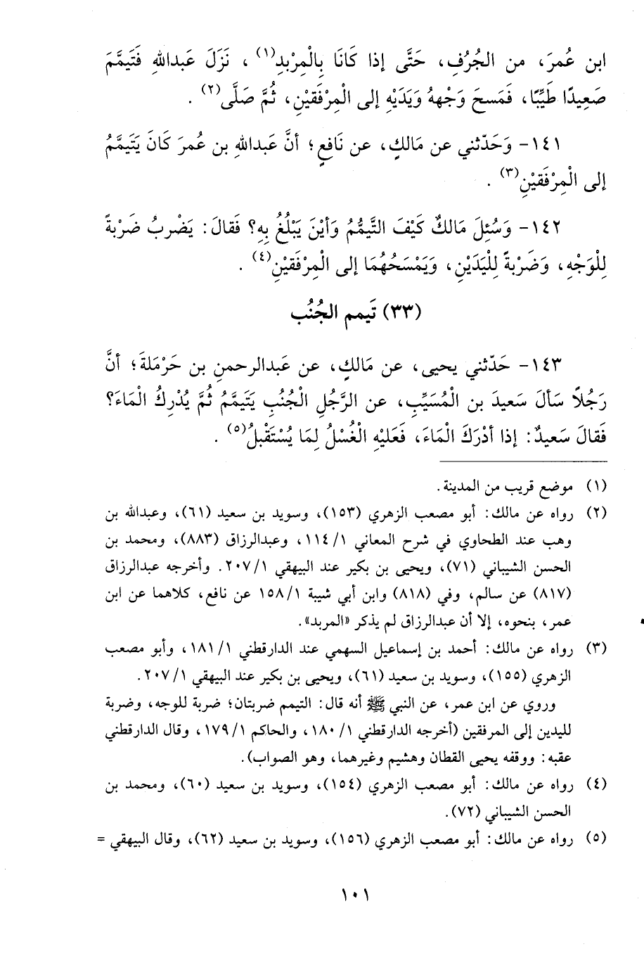 141 - وَحَدَّثَنِي عَنْ مَالِكٍ، عَنْ نَافِعٍ، أَنَّ عَبْدَ اللهِ بْنَ عُمَرَ كَانَ يَتَيَمَّمُ إِلَى الْمِرْفَقَيْنِ.