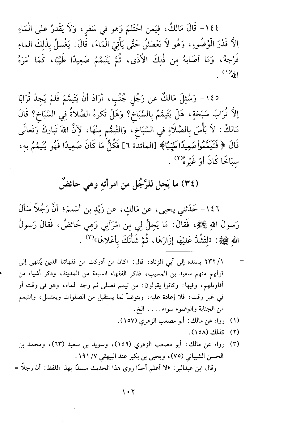 146 - حَدَّثَنِي يَحْيَى، عَنْ مَالِكٍ، عَنْ زَيْدِ بْنِ أَسْلَمَ، أَنَّ رَجُلاً سَأَلَ رَسُولَ اللهِ صَلى الله عَلَيهِ وَسَلمَ فَقَالَ: مَا يَحِلُّ لِي مِنِ امْرَأَتِي وَهِيَ حَائِضٌ؟ فَقَالَ: رَسُولُ اللهِ صَلى الله عَلَيهِ وَسَلمَ: لِتَشُدَّ عَلَيْهَا إِزَارَهَا ثُمَّ شَأْنَكَ بِأَعْلاَهَا.