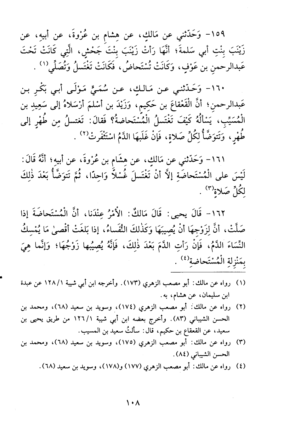159 - وَحَدَّثَنِي عَنْ مَالِكٍ، عَنْ هِشَامِ بْنِ عُرْوَةَ، عَنْ أَبِيهِ، عَنْ زَيْنَبَ بِنْتِ أَبِي سَلَمَةَ، أَنَّهَا رَأَتْ زَيْنَبَ بِنْتَ جَحْشٍ الَّتِي كَانَتْ تَحْتَ عَبْدِ الرَّحْمَنِ بْنِ عَوْفٍ وَكَانَتْ تُسْتَحَاضُ، فَكَانَتْ تَغْتَسِلُ وَتُصَلِّي.