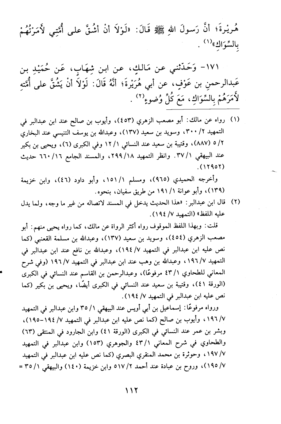 171 - وَحَدَّثَنِي عَنْ مَالِكٍ، عَنِ ابْنِ شِهَابٍ، عَنْ حُمَيْدِ بْنِ عَبْدِ الرَّحْمَنِ بْنِ عَوْفٍ، عنْ أَبِي هُرَيْرَةَ أَنَّهُ قَالَ: لوْلاَ أَنْ يَشُقَّ عَلَى أُمَّتِهِ لأَمَرَهُمْ بِالسِّوَاكِ مَعَ كُلِّ وُضُوءٍ.