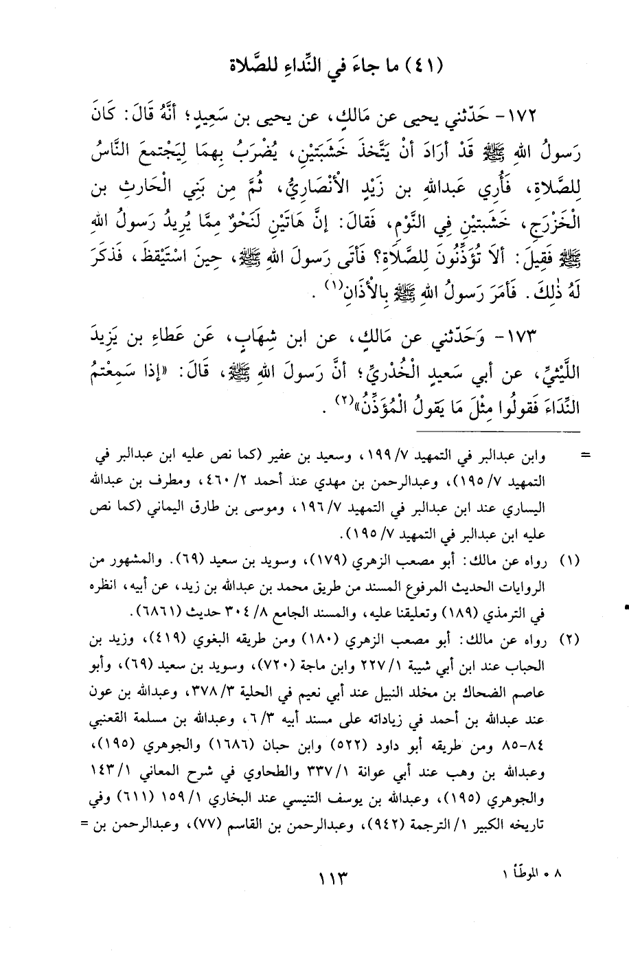 172 - حَدَّثَنِي يَحْيَى، عَنْ مَالِكٍ، عَنْ يَحْيَى بْنِ سَعِيدٍ أَنَّهُ قَالَ: كَانَ رَسُولُ اللهِ صَلى الله عَلَيهِ وَسَلمَ قَدْ أَرَادَ أَنْ يَتَّخِذَ خَشَبَتَيْنِ، يُضْرَبُ بِهِمَا لِيَجْتَمِعَ النَّاسُ لِلصَّلاَةِ، فَأُرِيَ عَبْدُ اللهِ بْنُ زَيْدٍ الأَنْصَارِيُّ، ثُمَّ مِنْ بَنِي الْحَارِثِ بْنِ الْخَزْرَجِ خَشَبَتَيْنِ فِي النَّوْمِ، فَقَالَ: إِنَّ هَاتَيْنِ لَنَحْوٌ مِمَّا يُرِيدُ رَسُولُ اللهِ صَلى الله عَلَيهِ وَسَلمَ، فَقِيلَ: أَلاَ تُؤَذِّنُونَ لِلصَّلاَةِ؟ فَأَتَى رَسُولَ اللهِ صَلى الله عَلَيهِ وَسَلمَ حِينَ اسْتَيْقَظَ، فَذَكَرَ لَهُ ذَلِكَ، فَأَمَرَ رَسُولُ اللهِ صَلى الله عَلَيهِ وَسَلمَ بِالأَذَانِ.
