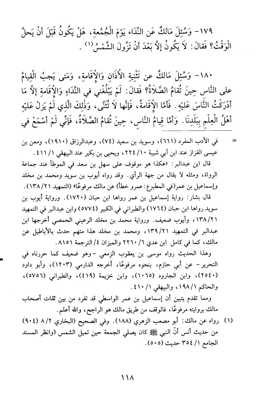 179 - وَسُئِلَ مَالِكٌ عَنِ النِّدَاءِ يَوْمَ الْجُمُعَةِ، هَلْ يَكُونُ قَبْلَ أَنْ يَحِلَّ الْوَقْتُ؟ فَقَالَ: لاَ يَكُونُ إِلاَّ بَعْدَ أَنْ تَزُولَ الشَّمْسُ.