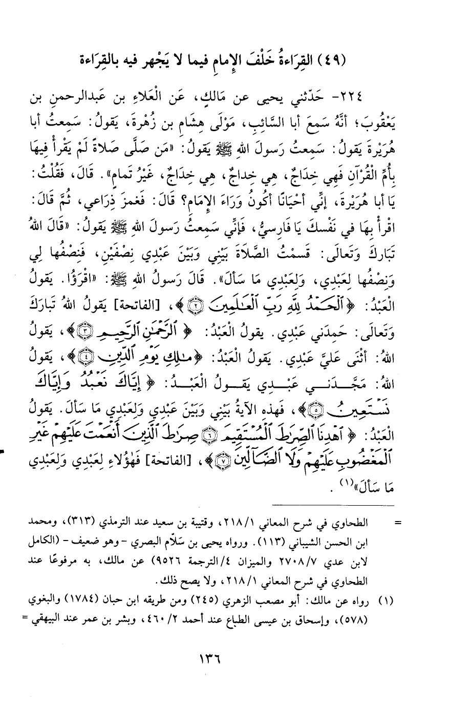 224 - حَدَّثَنِي يَحْيَى، عَنْ مَالِكٍ، عَنِ الْعَلاَءِ بْنِ عَبْدِ الرَّحْمَنِ بْنِ يَعْقُوبَ، أَنَّهُ سَمِعَ أَبَا السَّائِبِ، مَوْلَى هِشَامِ بْنِ زُهْرَةَ يَقُولُ: سَمِعْتُ أَبَا هُرَيْرَةَ يَقُولُ: سَمِعْتُ رَسُولَ اللهِ صَلى الله عَلَيهِ وَسَلمَ يَقُولُ: مَنْ صَلَّى صَلاَةً لَمْ يَقْرَأْ فِيهَا بِأُمِّ الْقُرْآنِ، فَهِيَ خِدَاجٌ، هِيَ خِدَاجٌ، هِيَ خِدَاجٌ، غَيْرُ تَمَامٍ، قَالَ: فَقُلْتُ: يَا أَبَا هُرَيْرَةَ، إِنِّي أَحْيَانًا أَكُونُ وَرَاءَ الإِمَامِ، قَالَ: فَغَمَزَ ذِرَاعِي، ثُمَّ قَالَ: اقْرَأْ بِهَا فِي نَفْسِكَ يَا فَارِسِيُّ، فَإِنِّي سَمِعْتُ رَسُولَ اللهِ صَلى الله عَلَيهِ وَسَلمَ يَقُولُ: قَالَ اللهُ تَبَارَكَ وَتَعَالَى: قَسَمْتُ الصَّلاَةَ بَيْنِي وَبَيْنَ عَبْدِي نِصْفَيْنِ، فَنِصْفُهَا لِي وَنِصْفُهَا لِعَبْدِي، وَلِعَبْدِي مَا سَأَلَ، قَالَ رَسُولُ اللهِ صَلى الله عَلَيهِ وَسَلمَ: اقْرَؤُوا، يَقُولُ الْعَبْدُ: {الْحَمْدُ لِلَّهِ رَبِّ الْعَالَمِينَ}، يَقُولُ اللهُ تَبَارَكَ وَتَعَالَى: حَمِدَنِي عَبْدِي، يَقُولُ الْعَبْدُ: {الرَّحْمَنِ الرَّحِيمِ}، يَقُولُ اللهُ: أَثْنَى عَلَيَّ عَبْدِي، يَقُولُ الْعَبْدُ: {مالِكِ يَوْمِ الدِّينِ} يَقُولُ اللهُ: مَجَّدَنِي عَبْدِي، يَقُولُ الْعَبْدُ: {إِيَّاكَ نَعْبُدُ وَإِيَّاكَ نَسْتَعِينُ}، فَهَذِهِ الآيَةُ بَيْنِي وَبَيْنَ عَبْدِي، وَلِعَبْدِي مَا سَأَلَ، يَقُولُ الْعَبْدُ: {اهْدِنَا الصِّرَاطَ الْمُسْتَقِيمَ صِرَاطَ الَّذِينَ أَنْعَمْتَ عَلَيْهِمْ غَيْرِ الْمَغْضُوبِ عَلَيْهِمْ وَلاَ الضَّالِّينَ}، فَهَؤُلاَءِ لِعَبْدِي، وَلِعَبْدِي مَا سَأَلَ.