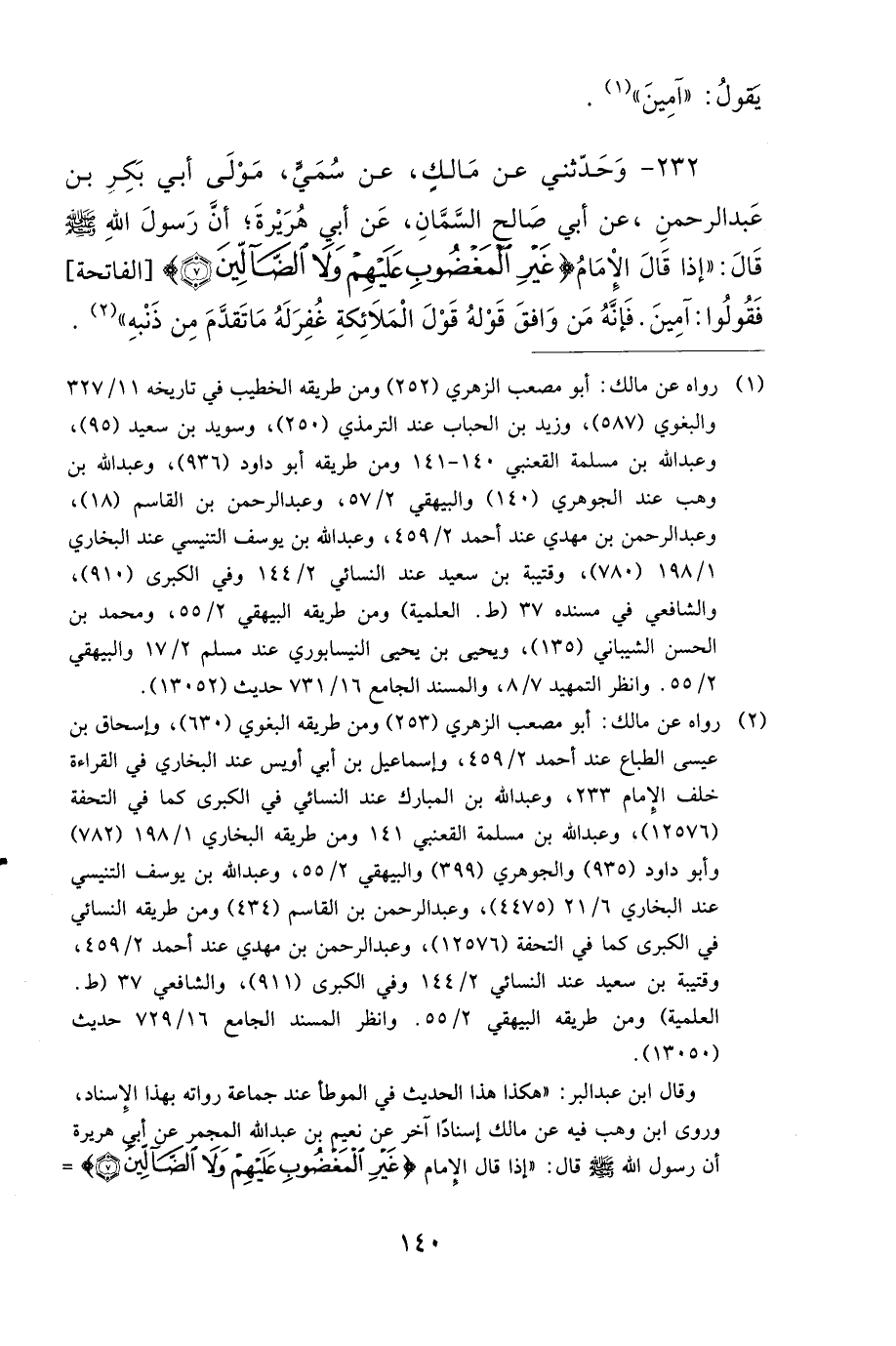 232- وَحَدَّثَنِي عَنْ مالِكٍ، عَنْ سُمَيٍّ، مَوْلَى أَبِي بَكْرٍ، عَنْ أَبِي صَالِحٍ السَّمَّانِ، عَنْ أَبِي هُرَيْرَةَ، أَنَّ رَسُولَ اللهِ صَلى الله عَلَيهِ وَسَلمَ قَالَ: إِذَا قَالَ الإِمَامُ: {غَيْرِ الْمَغْضُوبِ عَلَيْهِمْ وَلاَ الضَّالِّينَ} فَقُولُوا: آمِينَ، فَإِنَّهُ مَنْ وَافَقَ قَوْلُهُ قَوْلَ الْمَلاَئِكَةِ غُفِرَ لَهُ مَا تَقَدَّمَ مِنْ ذَنْبِهِ.