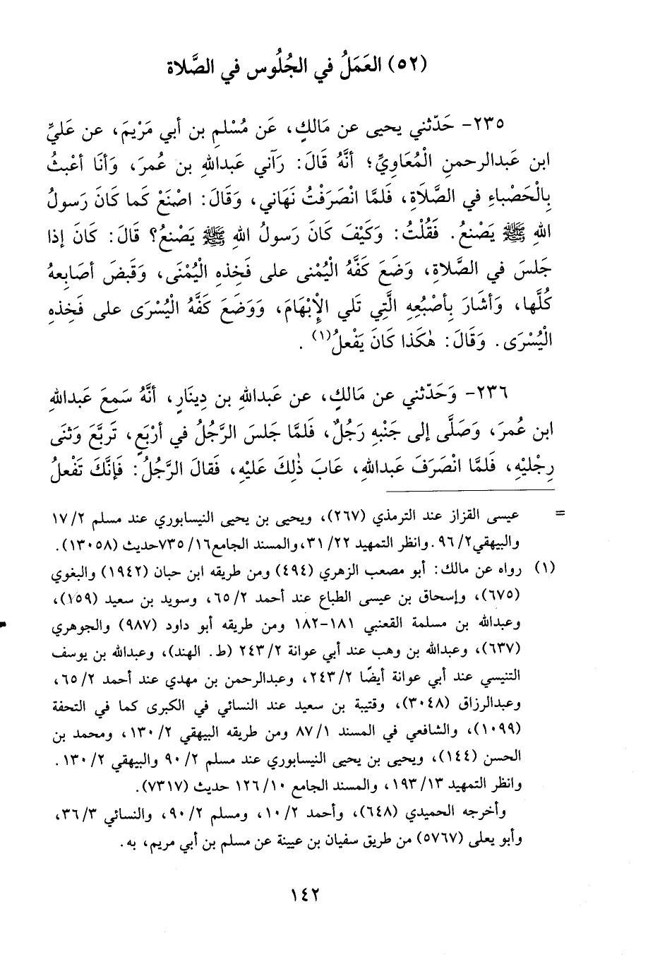 235- حَدَّثَنِي يَحْيَى، عَنْ مالِكٍ، عَنْ مُسْلِمِ بْنِ أَبِي مَرْيَمَ، عَنْ عَلِيِّ بْنِ عَبْدِ الرَّحْمَنِ الْمُعَاوِيِّ، أَنَّهُ قَالَ: رَآنِي عَبْدُ اللهِ بْنُ عُمَرَ، وَأَنَا أَعْبَثُ بِالْحَصْبَاءِ فِي الصَّلاَةِ، فَلَمَّا انْصَرَفْتُ نَهَانِي، وَقَالَ: اصْنَعْ كَمَا كَانَ رَسُولُ اللهِ صَلى الله عَلَيهِ وَسَلمَ يَصْنَعُ، فَقُلْتُ: وَكَيْفَ كَانَ رَسُولُ اللهِ صَلى الله عَلَيهِ وَسَلمَ يَصْنَعُ؟ قَالَ: كَانَ إِذَا جَلَسَ فِي الصَّلاَةِ، وَضَعَ كَفَّهُ الْيُمْنَى عَلَى فَخِذِهِ الْيُمْنَى، وَقَبَضَ أَصَابِعَهُ كُلَّهَا، وَأَشَارَ بِأَصْبُعِهِ الَّتِي تَلِي الإِبْهَامَ، وَوَضَعَ كَفَّهُ الْيُسْرَى عَلَى فَخِذِهِ الْيُسْرَى، وَقَالَ: هَكَذَا كَانَ يَفْعَلُ.