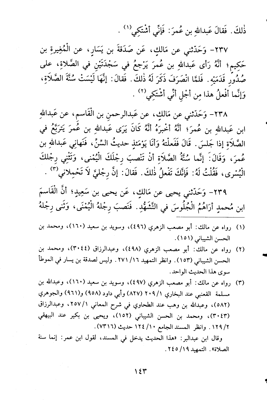237- وَحَدَّثَنِي عَنْ مَالِكٍ، عَنْ صَدَقَةَ بْنِ يَسَارٍ، عَنِ الْمُغِيرَةِ بْنِ حَكِيمٍ، أَنَّهُ رَأَى عَبْدَ اللهِ بْنَ عُمَرَ يَرْجِعُ فِي سَجْدَتَيْنِ فِي الصَّلاَةِ، عَلَى صُدُورِ قَدَمَيْهِ، فَلَمَّا انْصَرَفَ، ذَكَرَ لَهُ ذَلِكَ، فَقَالَ: إِنَّهَا لَيْسَتْ سُنَّةَ الصَّلاَةِ، وَإِنَّمَا أَفْعَلُ هَذَا مِنْ أَجْلِ أَنِّي أَشْتَكِي.