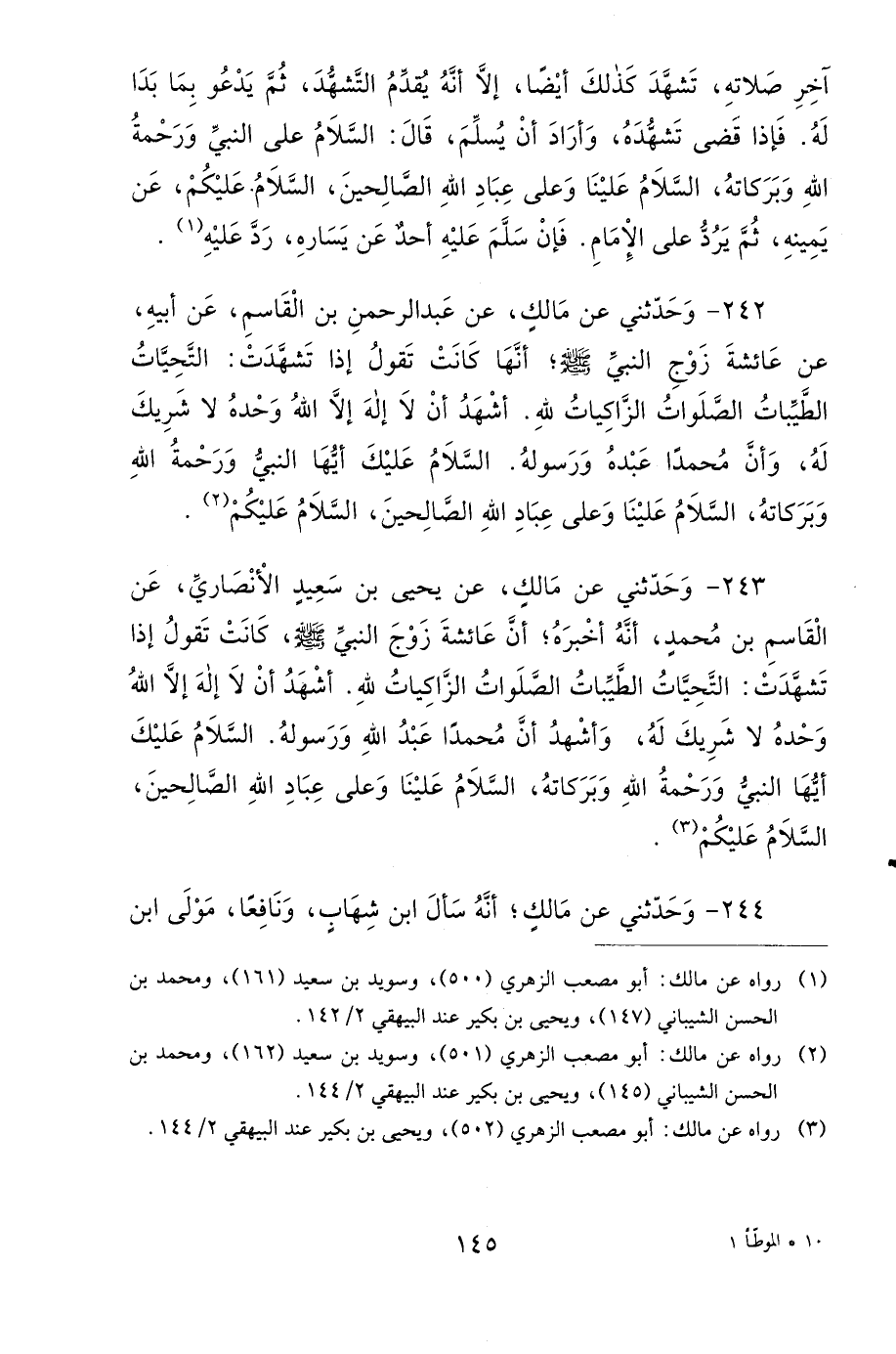242- وَحَدَّثَنِي عَنْ مَالِكٍ، عَنْ عَبْدِ الرَّحْمَنِ بْنِ الْقَاسِمِ، عَنْ أَبِيهِ، عَنْ عَائِشَةَ، زَوْجِ النَّبِيِّ صَلى الله عَلَيهِ وَسَلمَ، أَنَّهَا كَانَتْ تَقُولُ إِذَا تَشَهَّدَتِ: التَّحِيَّاتُ الطَّيِّبَاتُ، الصَّلَوَاتُ الزَّاكِيَاتُ لِلَّهِ، أَشْهَدُ أَنْ لاَ إِلَهَ إِلاَّ اللهُ، وَحْدَهُ لاَ شَرِيكَ لَهُ، وَأَنَّ مُحَمَّدًا عَبْدُهُ وَرَسُولُهُ، السَّلاَمُ عَلَيْكَ أَيُّهَا النَّبِيُّ وَرَحْمَةُ اللهِ وَبَرَكَاتُهُ، السَّلاَمُ عَلَيْنَا وَعَلَى عِبَادِ اللهِ الصَّالِحِينَ، السَّلاَمُ عَلَيْكُمْ.