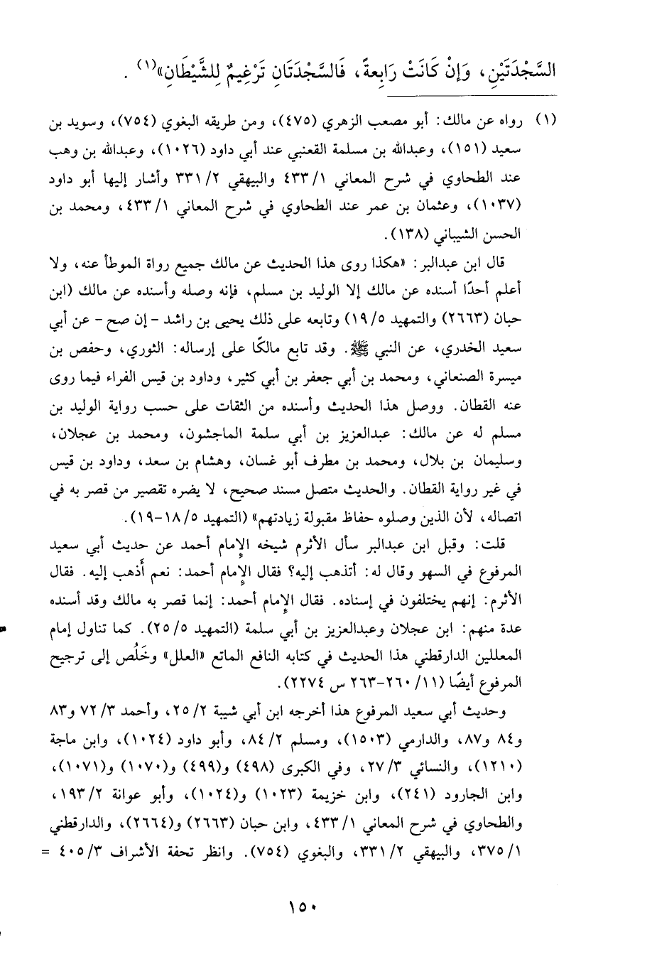 252- حَدَّثَنِي يَحْيَى، عَنْ مَالِكٍ، عَنْ زَيْدِ بْنِ أَسْلَمَ، عَنْ عَطَاءِ بْنِ يَسَارٍ، أَنَّ رَسُولَ اللهِ صَلى الله عَلَيهِ وَسَلمَ قَالَ: إِذَا شَكَّ أَحَدُكُمْ فِي صَلاَتِهِ، فَلَمْ يَدْرِ كَمْ صَلَّى، أَثَلاَثًا أَمْ أَرْبَعًا؟ فَلْيُصَلِّي رَكْعَةً، وَلْيَسْجُدْ سَجْدَتَيْنِ وَهُوَ جَالِسٌ، قَبْلَ التَّسْلِيمِ، فَإِنْ كَانَتِ الرَّكْعَةُ الَّتِي صَلَّى خَامِسَةً، شَفَعَهَا بِهَاتَيْنِ السَّجْدَتَيْنِ، وَإِنْ كَانَتْ رَابِعَةً، فَالسَّجْدَتَانِ تَرْغِيمٌ لِلشَّيْطَانِ.