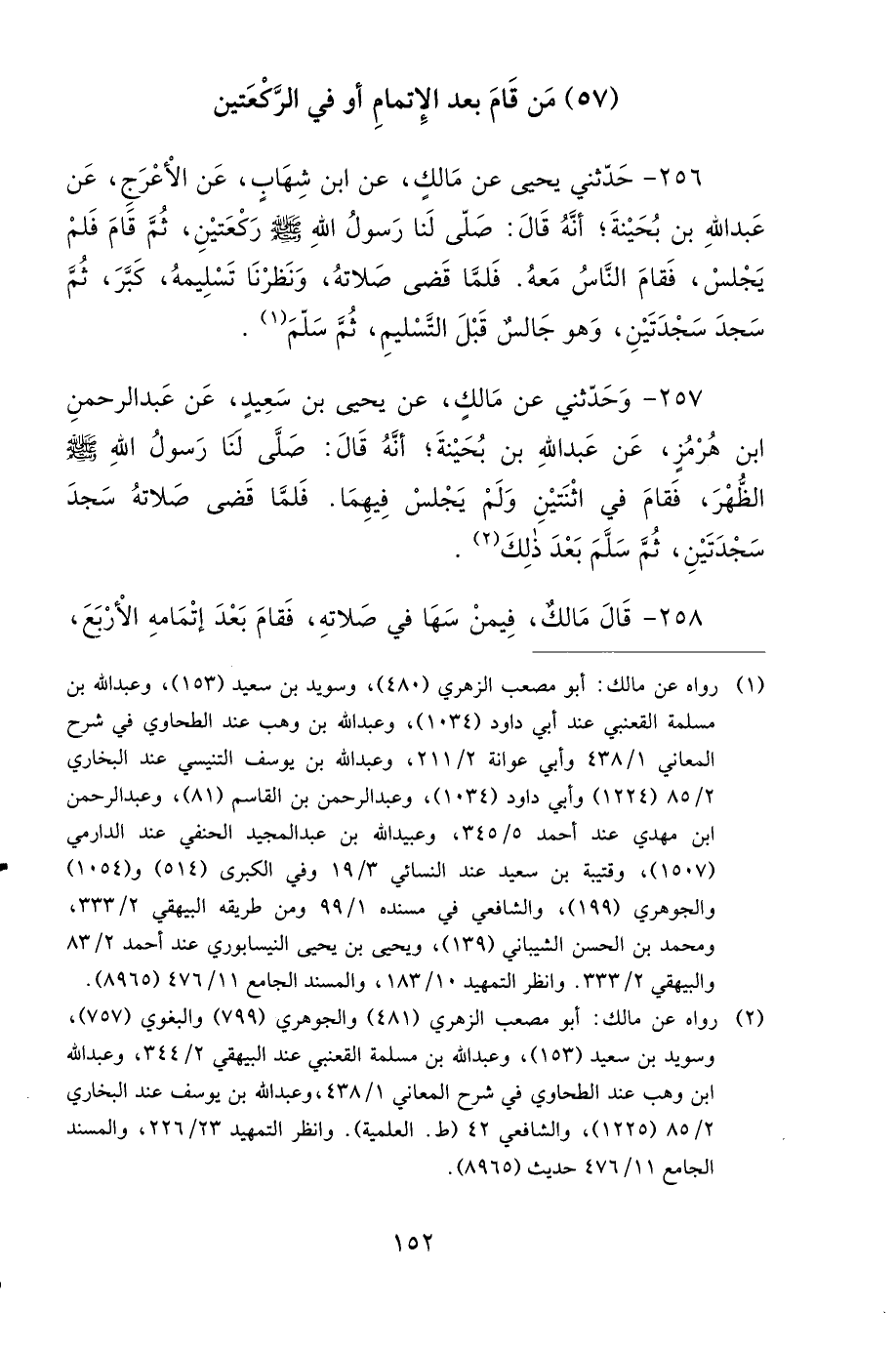257- وَحَدَّثَنِي عَنْ مَالِكٍ (1)، عَنْ يَحْيَى بْنِ سَعِيدٍ، عَنْ عَبْدِ الرَّحْمَنِ بْنِ هُرْمُزَ، عَنْ عَبْدِ اللهِ ابْنِ بُحَيْنَةَ أَنَّهُ قَالَ: صَلَّى لَنَا رَسُولُ اللهِ صَلى الله عَلَيهِ وَسَلمَ الظُّهْرَ، فَقَامَ فِي اثْنَتَيْنِ وَلَمْ يَجْلِسْ فِيهِمَا، فَلَمَّا قَضَى صَلاَتَهُ، سَجَدَ سَجْدَتَيْنِ ثُمَّ سَلَّمَ بَعْدَ ذَلِكَ.
