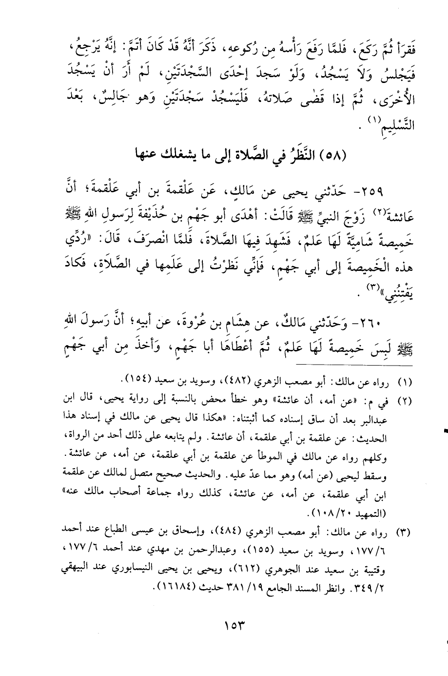 259- حَدَّثَنِي يَحْيَى، عَنْ مَالِكٍ، عَنْ عَلْقَمَةَ بْنِ أَبِي عَلْقَمَةَ، أَنَّ عَائِشَةَ زَوْجَ النَّبِيِّ صَلى الله عَلَيهِ وَسَلمَ قَالَتْ: أَهْدَى أَبُو جَهْمِ بْنُ حُذَيْفَةَ لِرَسُولِ اللهِ صَلى الله عَلَيهِ وَسَلمَ خَمِيصَةً شَامِيَّةً، لَهَا عَلَمٌ، فَشَهِدَ فِيهَا الصَّلاَةَ، فَلَمَّا انْصَرَفَ قَالَ: رُدِّي هَذِهِ الْخَمِيصَةَ إِلَى أبِي جَهْمٍ، فَإِنِّي نَظَرْتُ إِلَى عَلَمِهَا فِي الصَّلاَةِ، فَكَادَ يَفْتِنُنِي.