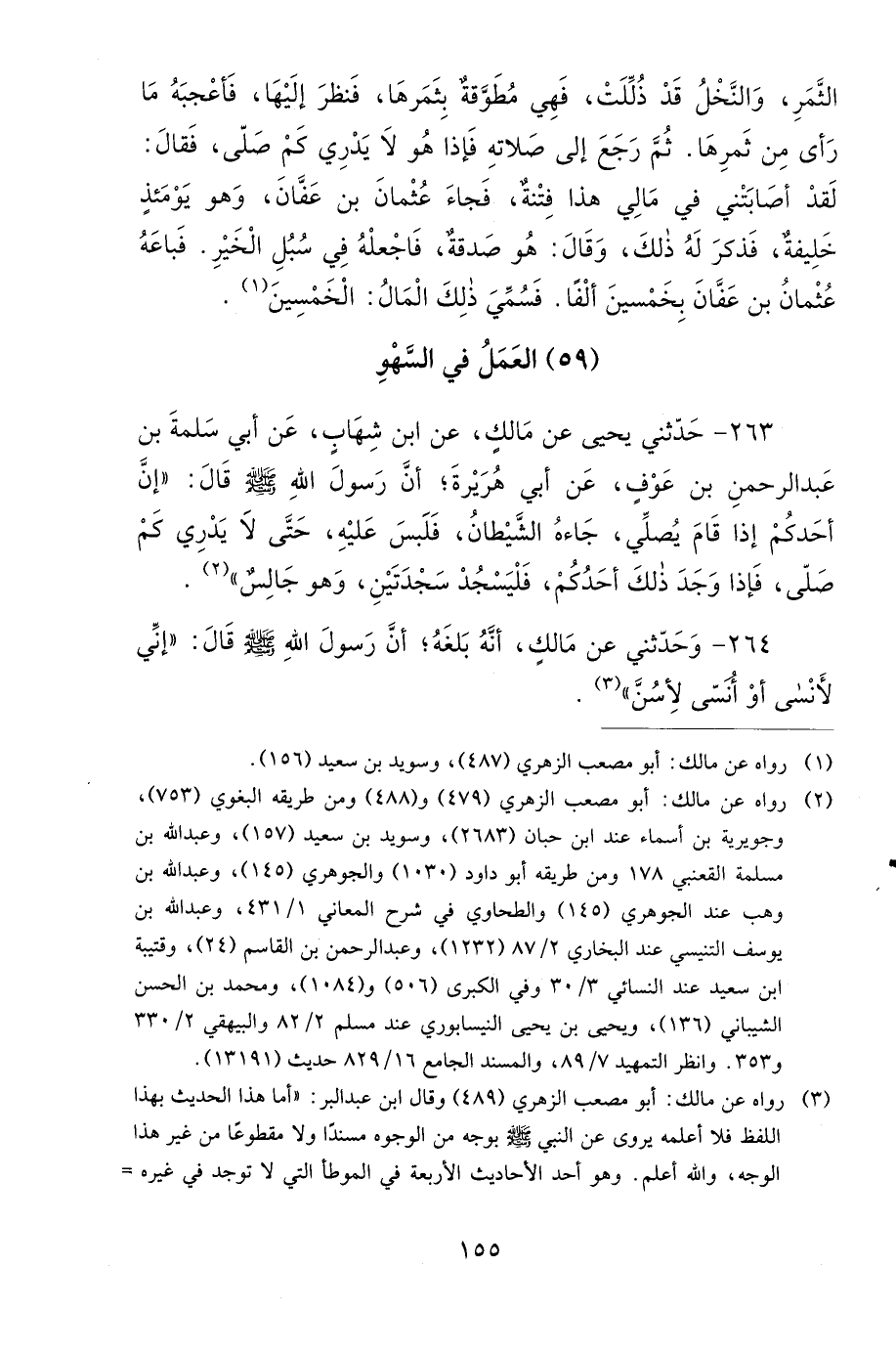 264- وَحَدَّثَنِي عَنْ مَالِكٍ؛ أَنَّهُ بَلَغَهُ، أَنَّ رَسُولَ اللهِ صَلى الله عَلَيهِ وَسَلمَ قَالَ: إِنِّي لأَنْسَى أَوْ أُنَسَّى لأَسُنَّ.