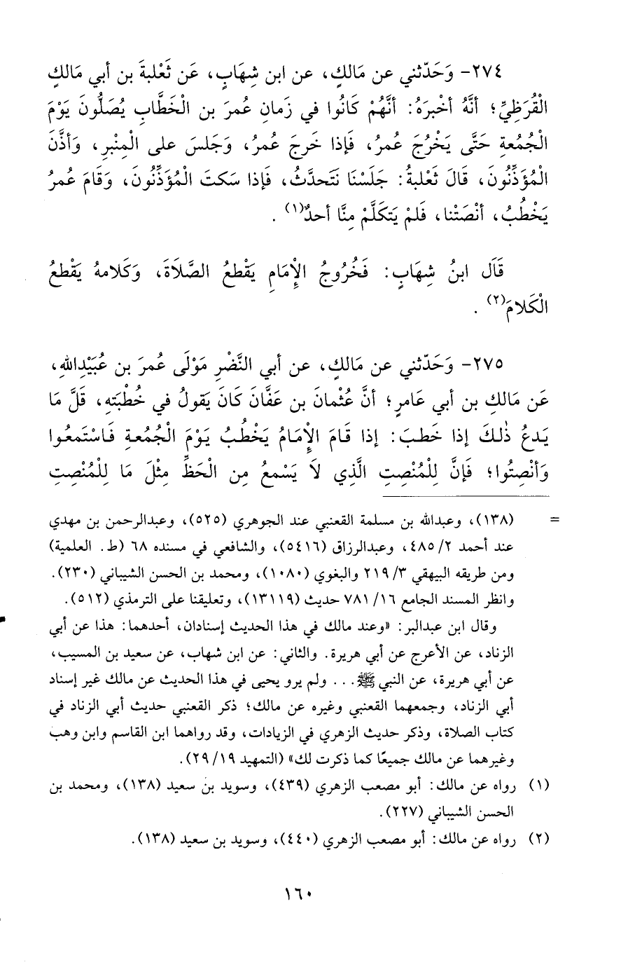274- وَحَدَّثَنِي عَنْ مَالِكٍ، عَنِ ابْنِ شِهَابٍ، عَنْ ثَعْلَبَةَ بْنِ أَبِي مَالِكٍ الْقُرَظِيِّ، أَنَّهُ أَخْبَرَهُ، أَنَّهُمْ كَانُوا فِي زَمَانِ عُمَرَ بْنِ الْخَطَّابِ، يُصَلُّونَ يَوْمَ الْجُمُعَةِ، حَتَّى يَخْرُجَ عُمَرُ، فَإِذَا خَرَجَ عُمَرُ، وَجَلَسَ عَلَى الْمِنْبَرِ، وَأَذَّنَ الْمُؤَذِّنُونَ، قَالَ ثَعْلَبَةُ: جَلَسْنَا نَتَحَدَّثُ، فَإِذَا سَكَتَ الْمُؤَذِّنُونَ وَقَامَ عُمَرُ يَخْطُبُ، أَنْصَتْنَا، فَلَمْ يَتَكَلَّمْ مِنَّا أَحَدٌ.