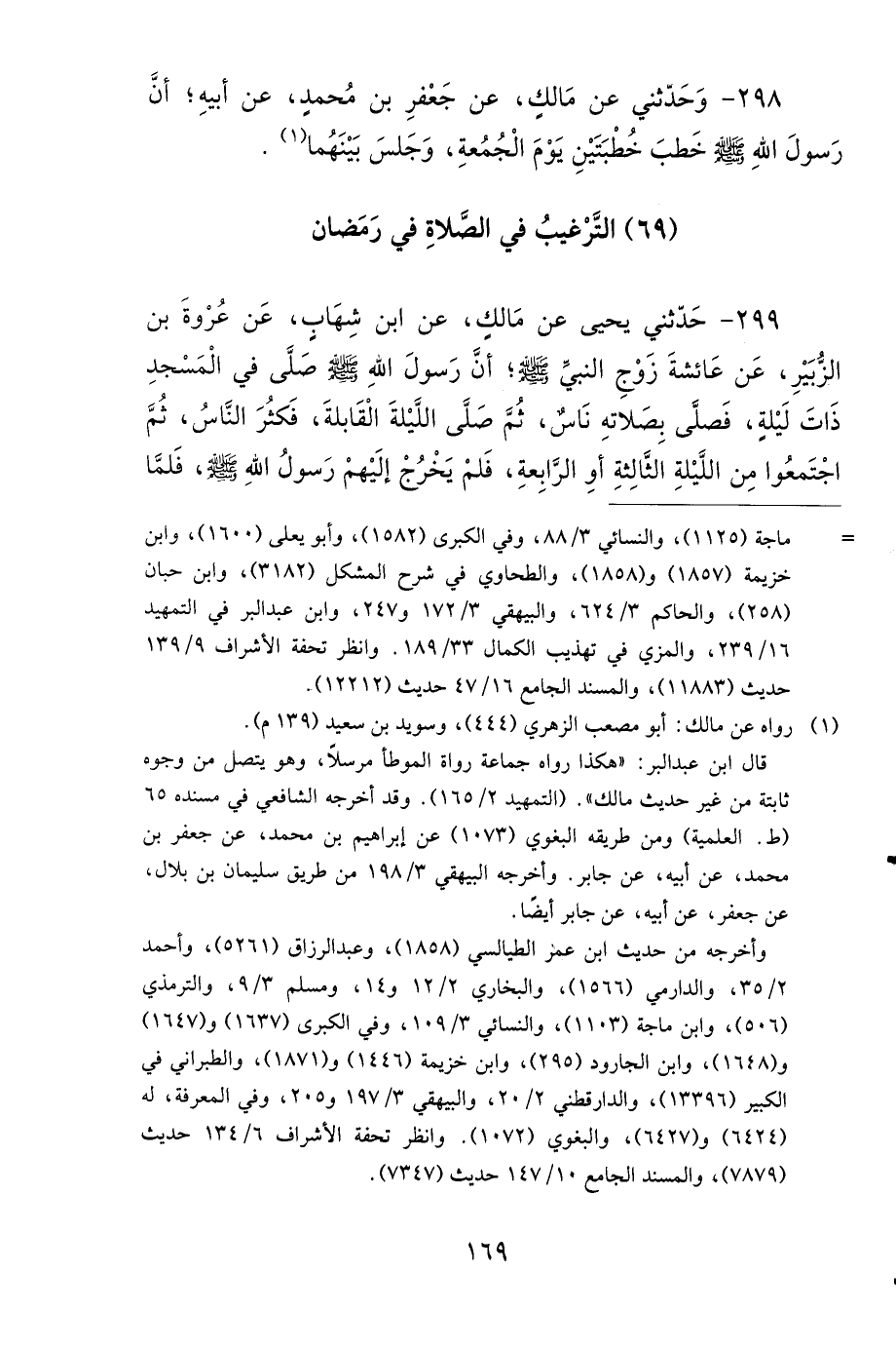299- حَدَّثَنِي يَحْيَى، عَنْ مَالِكٍ، عَنِ ابْنِ شِهَابٍ، عَنْ عُرْوَةَ بْنِ الزُّبَيْرِ، عَنْ عَائِشَةَ، زَوْجِ النَّبِيِّ صَلى الله عَلَيهِ وَسَلمَ، أَنَّ رَسُولَ اللهِ صَلى الله عَلَيهِ وَسَلمَ صَلَّى فِي الْمَسْجِدِ ذَاتَ لَيْلَةٍ، فَصَلَّى بِصَلاَتِهِ نَاسٌ، ثُمَّ صَلَّى اللَّيْلَةَ الْقَابِلَةَ، فَكَثُرَ النَّاسُ، ثُمَّ اجْتَمَعُوا مِنَ اللَّيْلَةِ الثَّالِثَةِ أَوِ الرَّابِعَةِ، فَلَمْ يَخْرُجْ إِلَيْهِمْ رَسُولُ اللهِ صَلى الله عَلَيهِ وَسَلمَ، فَلَمَّا أَصْبَحَ، قَالَ: قَدْ رَأَيْتُ الَّذِي صَنَعْتُمْ، وَلَمْ يَمْنَعْنِي مِنَ الْخُرُوجِ إِلَيْكُمْ، إِلاَّ أَنِّي خَشِيتُ أَنْ تُفْرَضَ عَلَيْكُمْ، وَذَلِكَ فِي رَمَضَانَ.