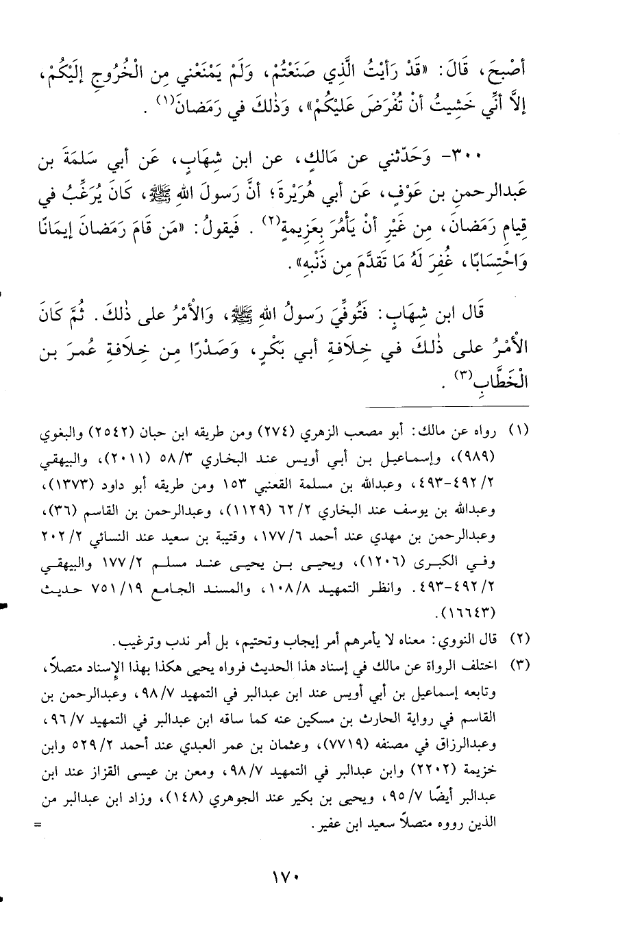 300- وَحَدَّثَنِي عَنْ مَالِكٍ، عَنِ ابْنِ شِهَابٍ، عَنْ أَبِي سَلَمَةَ بْنِ عَبْدِ الرَّحْمَنِ بْنِ عَوْفٍ، عَنْ أَبِي هُرَيْرَةَ، أَنَّ رَسُولَ اللهِ صَلى الله عَلَيهِ وَسَلمَ كَانَ يُرَغِّبُ فِي قِيَامِ رَمَضَانَ، مِنْ غَيْرِ أَنْ يَأْمُرَ بِعَزِيمَةٍ، فَيَقُولُ: مَنْ قَامَ رَمَضَانَ إِيمَانًا وَاحْتِسَابًا، غُفِرَ لَهُ مَا تَقَدَّمَ مِنْ ذَنْبِهِ.