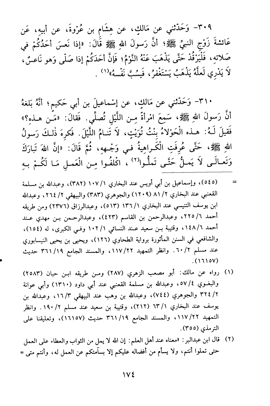 310- وَحَدَّثَنِي عَنْ مَالِكٍ، عَنْ إِسْمَاعِيلَ بْنِ أَبِي حَكِيمٍ، أَنَّهُ بَلَغَهُ، أَنَّ رَسُولَ اللهِ صَلى الله عَلَيهِ وَسَلمَ سَمِعَ امْرَأَةً مِنَ اللَّيْلِ تُصَلِّي، فَقَالَ: مَنْ هَذِهِ؟ فَقِيلَ لَهُ: هَذِهِ الْحَوْلاَءُ بِنْتُ تُوَيْتٍ لاَ تَنَامُ اللَّيْلَ، فَكَرِهَ ذَلِكَ رَسُولُ اللهِ صَلى الله عَلَيهِ وَسَلمَ، حَتَّى عُرِفَتِ الْكَرَاهِيَةُ فِي وَجْهِهِ، ثُمَّ قَالَ: إِنَّ اللهَ تَبَارَكَ وَتَعَالَى لاَ يَمَلُّ حَتَّى تَمَلُّوا، اكْلَفُوا مِنَ الْعَمَلِ مَا لَكُمْ بِهِ طَاقَةٌ.