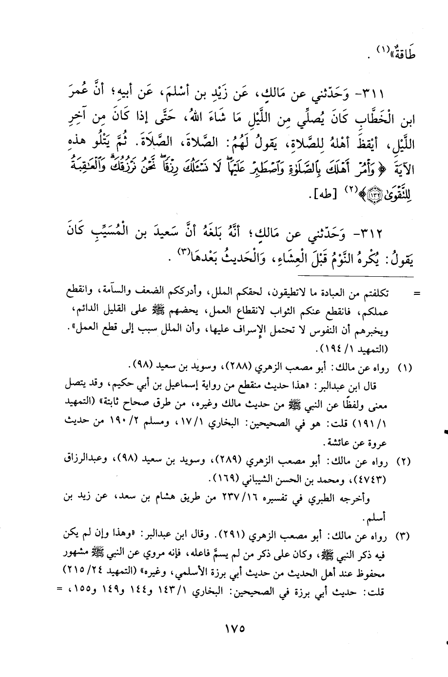 311- وَحَدَّثَنِي عَنْ مَالِكٍ، عَنْ زَيْدِ بْنِ أَسْلَمَ، عَنْ أَبِيهِ، أَنَّ عُمَرَ بْنَ الْخَطَّابِ كَانَ يُصَلِّي مِنَ اللَّيْلِ مَا شَاءَ اللهُ، حَتَّى إِذَا كَانَ مِنْ آخِرِ اللَّيْلِ، أَيْقَظَ أَهْلَهُ لِلصَّلاَةِ، يَقُولُ لَهُمُ: الصَّلاَةَ الصَّلاَةَ، ثُمَّ يَتْلُو هَذِهِ الآيَةَ: {وَأْمُرْ أَهْلَكَ بِالصَّلاَةِ وَاصْطَبِرْ عَلَيْهَا لاَ نَسْأَلُكَ رِزْقًا نَحْنُ نَرْزُقُكَ وَالْعَاقِبَةُ لِلتَّقْوَى}.