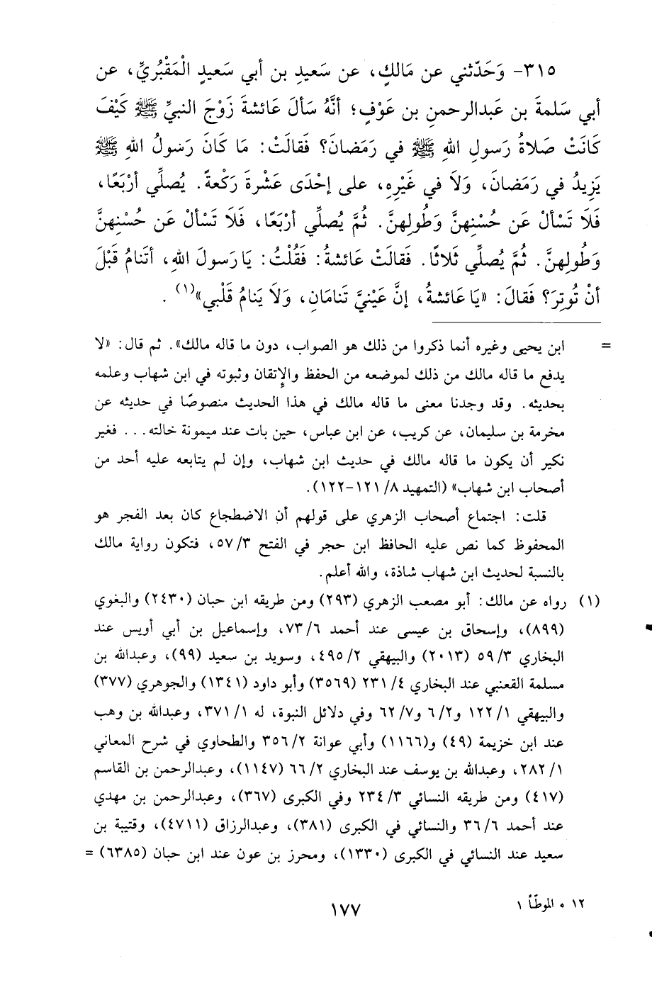 315- وَحَدَّثَنِي عَنْ مَالِكٍ، عَنْ سَعِيدِ بْنِ أَبِي سَعِيدٍ الْمَقْبُرِيِّ، عَنْ أَبِي سَلَمَةَ بْنِ عَبْدِ الرَّحْمَنِ بْنِ عَوْفٍ، أَنَّهُ سَأَلَ عَائِشَةَ، زَوْجَ النَّبِيِّ صَلى الله عَلَيهِ وَسَلمَ، كَيْفَ كَانَتْ صَلاَةُ رَسُولِ اللهِ صَلى الله عَلَيهِ وَسَلمَ فِي رَمَضَانَ؟ فَقَالَتْ: مَا كَانَ رَسُولُ اللهِ صَلى الله عَلَيهِ وَسَلمَ يَزِيدُ فِي رَمَضَانَ، وَلاَ فِي غَيْرِهِ، عَلَى إِحْدَى عَشْرَةَ رَكْعَةً، يُصَلِّي أَرْبَعًا، فَلاَ تَسْأَلْ عَنْ حُسْنِهِنَّ وَطُولِهِنَّ، ثُمَّ يُصَلِّي أَرْبَعًا، فَلاَ تَسْأَلْ عَنْ حُسْنِهِنَّ وَطُولِهِنَّ، ثُمَّ يُصَلِّي ثَلاَثًا، فَقَالَتْ عَائِشَةُ: فَقُلْتُ: يَا رَسُولَ اللهِ، أَتَنَامُ قَبْلَ أَنْ تُوتِرَ؟ فَقَالَ: يَا عَائِشَةُ، إِنَّ عَيْنَيَّ تَنَامَانِ وَلاَ يَنَامُ قَلْبِي.