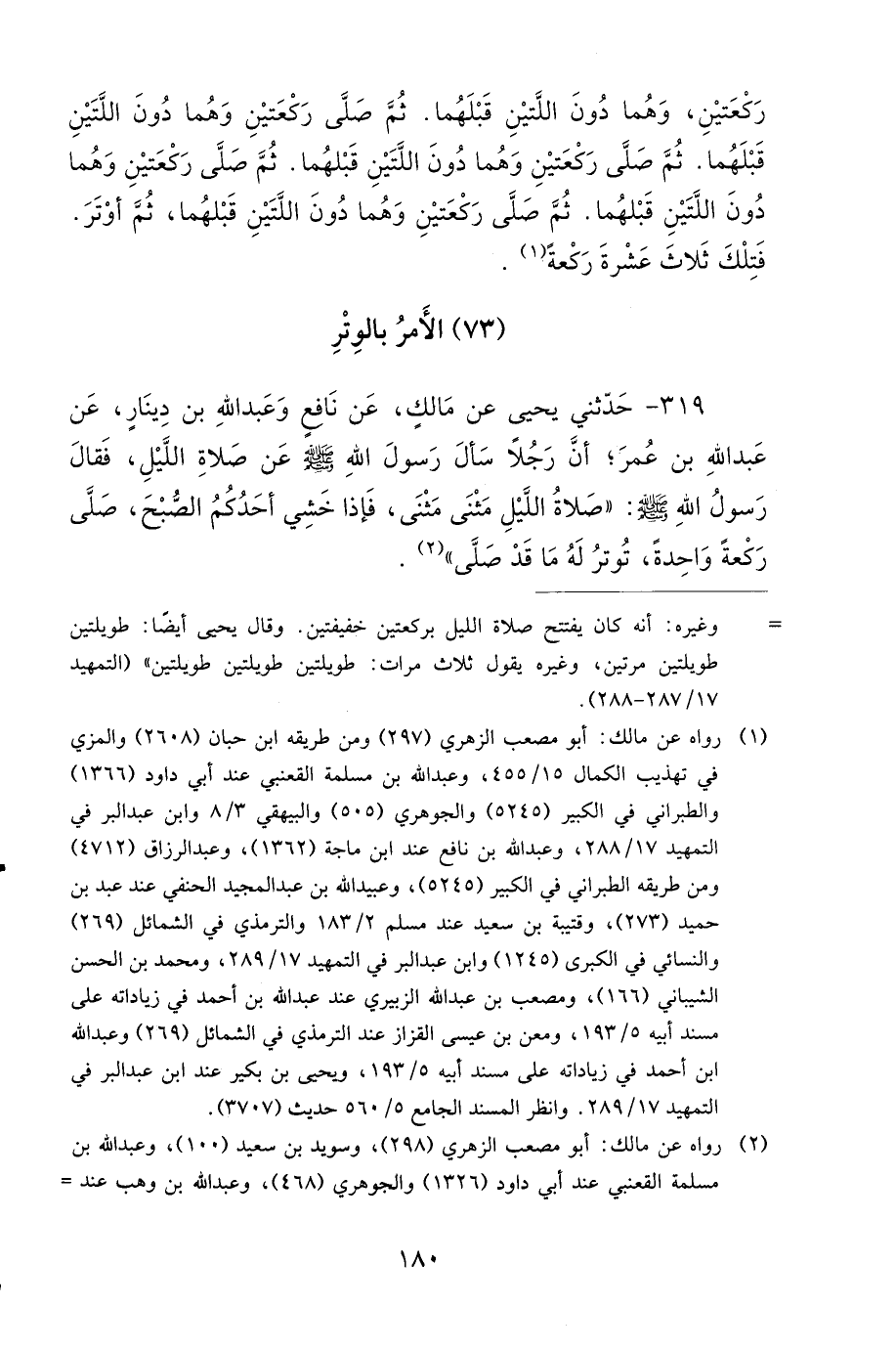(1) وهو في رواية أَبِي مُصْعَب الزُّهْرِي، للموطأ (298)، والقَعْنَبِي (162)، وسُوَيْد بن سَعِيد (100)، وورد في مسند الموطأ (468 و648).