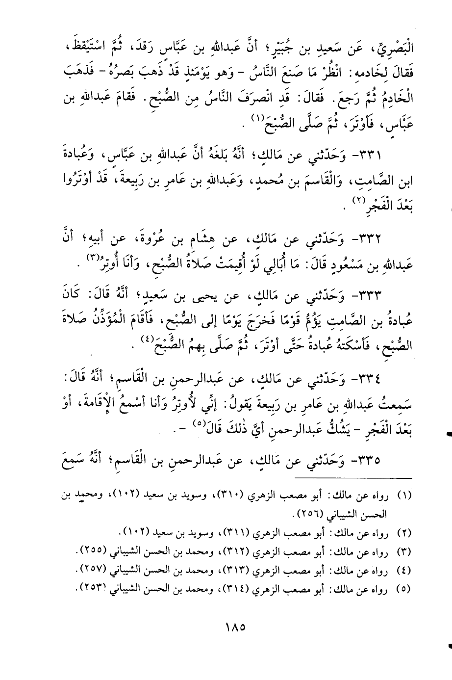331- وَحَدَّثَنِي عَنْ مَالِكٍ؛ أَنَّهُ بَلَغَهُ أَنَّ عَبْدَ اللهِ بْنَ عَبَّاسٍ، وَعُبَادَةَ بْنَ الصَّامِتِ، وَالْقَاسِمَ بْنَ مُحَمَّدٍ، وَعَبْدَ اللهِ بْنَ عَامِرِ بْنِ رَبِيعَةَ، قَدْ أَوْتَرُوا بَعْدَ الْفَجْرِ.