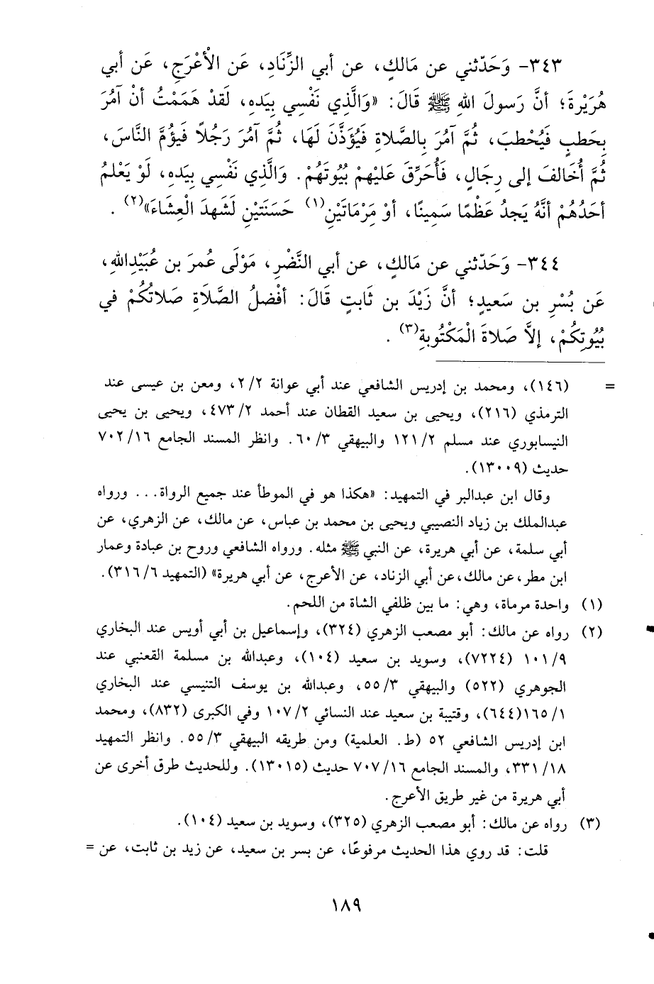 343- وَحَدَّثَنِي عَنْ مَالِكٍ، عَنْ أَبِي الزِّنَادِ، عَنِ الأَعْرَجِ، عَنْ أَبِي هُرَيْرَةَ، أَنَّ رَسُولَ اللهِ صَلى الله عَلَيهِ وَسَلمَ قَالَ: وَالَّذِي نَفْسِي بِيَدِهِ، لَقَدْ هَمَمْتُ أَنْ آمُرَ بِحَطَبٍ فَيُحْطَبَ، ثُمَّ آمُرَ بِالصَّلاَةِ فَيُؤَذَّنَ لَهَا، ثُمَّ آمُرَ رَجُلاً فَيَؤُمَّ النَّاسَ، ثُمَّ أُخَالِفَ إِلَى رِجَالٍ، فَأُحَرِّقَ عَلَيْهِمْ بُيُوتَهُمْ، وَالَّذِي نَفْسِي بِيَدِهِ، لَوْ يَعْلَمُ أَحَدُهُمْ أَنَّهُ يَجِدُ عَظْمًا سَمِينًا أَوْ مِرْمَاتَيْنِ حَسَنَتَيْنِ لَشَهِدَ الْعِشَاءَ.