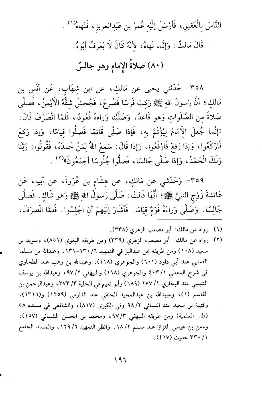 359- وَحَدَّثَنِي عَنْ مَالِكٍ، عَنْ هِشَامِ بْنِ عُرْوَةَ، عَنْ أَبِيهِ، عَنْ عَائِشَةَ، زَوْجِ النَّبِيِّ صَلى الله عَلَيهِ وَسَلمَ، أَنَّهَا قَالَتْ: صَلَّى رَسُولُ اللهِ صَلى الله عَلَيهِ وَسَلمَ وَهُوَ شَاكٍ فَصَلَّى جَالِسًا، وَصَلَّى وَرَاءَهُ قَوْمٌ قِيَامًا، فَأَشَارَ إِلَيْهِمْ أَنِ اجْلِسُوا، فَلَمَّا انْصَرَفَ قَالَ: إِنَّمَا جُعِلَ الإِمَامُ لِيُؤْتَمَّ بِهِ، فَإِذَا رَكَعَ فَارْكَعُوا، وَإِذَا رَفَعَ فَارْفَعُوا، وَإِذَا صَلَّى جَالِسًا، فَصَلُّوا جُلُوسًا.