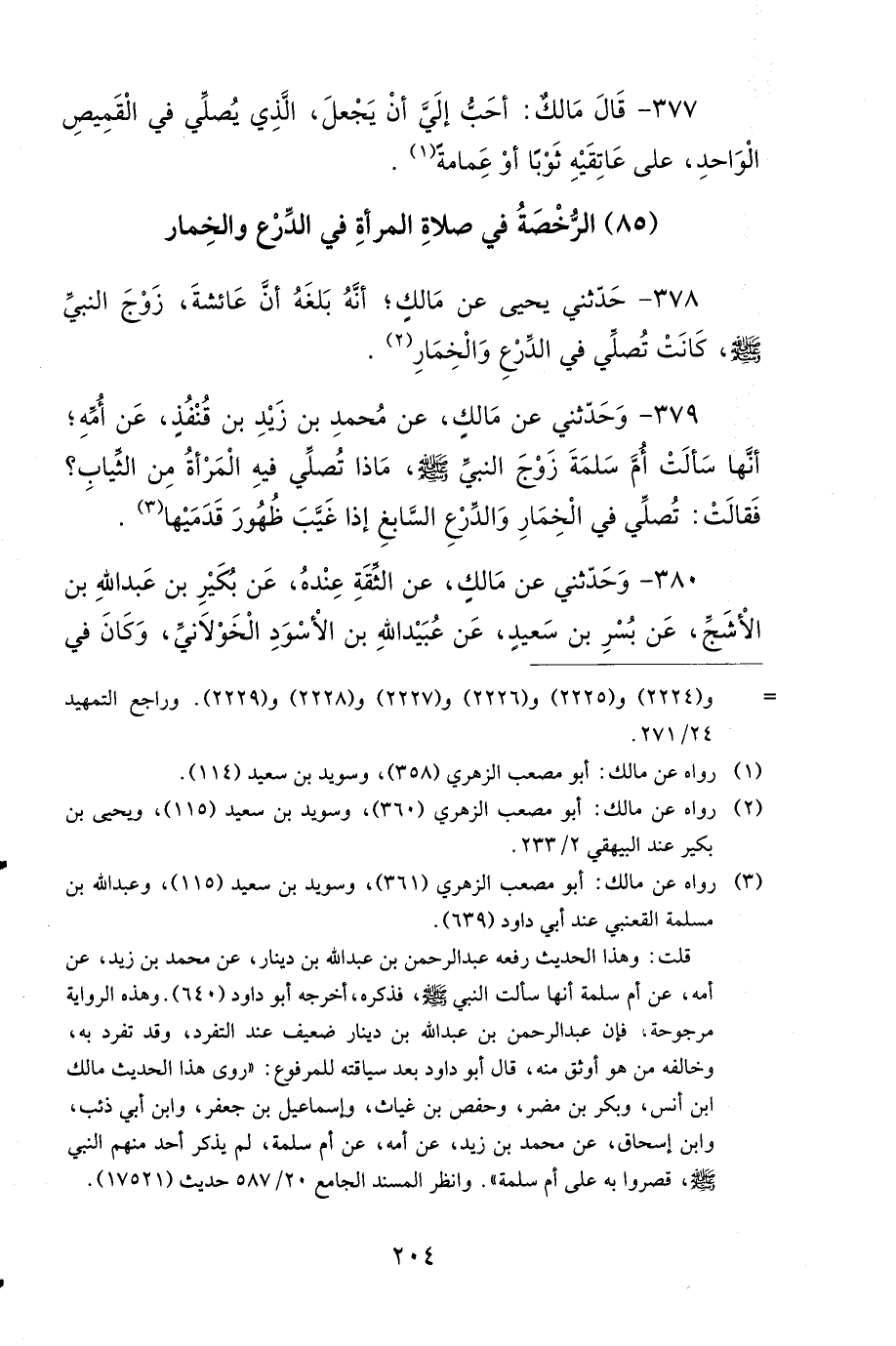 379- وَحَدَّثَنِي عَنْ مَالِكٍ، عَنْ مُحَمَّدِ بْنِ زَيْدِ بْنِ قُنْفُذٍ، عَنْ أُمِّهِ، أَنَّهَا سَأَلَتْ أُمَّ سَلَمَةَ، زَوْجَ النَّبِيِّ صَلى الله عَلَيهِ وَسَلمَ، مَاذَا تُصَلِّي فِيهِ الْمَرْأَةُ مِنَ الثِّيَابِ؟ فَقَالَتْ: تُصَلِّي فِي الْخِمَارِ وَالدِّرْعِ السَّابِغِ إِذَا غَيَّبَ ظُهُورَ قَدَمَيْهَا.