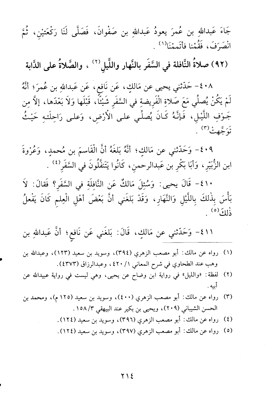 410- قَالَ يَحْيَى: وَسُئِلَ مالكٌ عَنِ النَّافِلَةِ فِي السَّفَرِ، فَقَالَ: لاَ بَأْسَ بِذَلِكَ، بِاللَّيْلِ وَالنَّهَارِ، وَقَدْ بَلَغَنِي أَنَّ بَعْضَ أَهْلِ الْعِلْمِ كَانَ يَفْعَلُ ذَلِكَ.